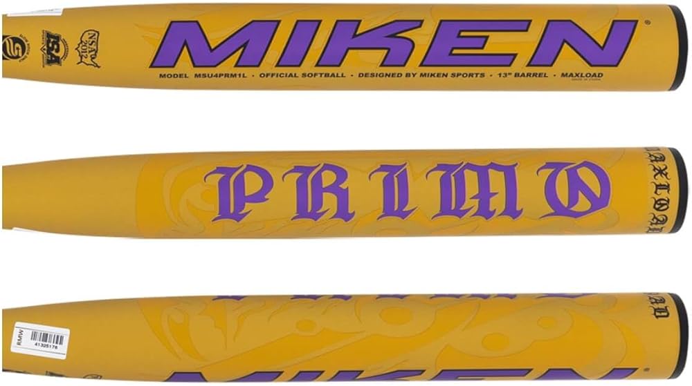 Miken Primo 13" Maxload USSSA Slow Pitch Softball Bat: MSU4PRM1L Unleash your hitting power with the Miken Primo 13" Maxload USSSA Slow Pitch Softball Bat! Engineered for performance, this bat will transform your game and help you dominate the field. Bat Benefits The Miken Primo 13" Maxload features a slightly end-loaded swing feel, courtesy of its .5oz end-load, providing that extra momentum needed for powerful hits. With a 2 1/4-inch barrel diameter and a 13-inch barrel length, this bat offers a compact yet potent sweet spot, ensuring consistent, powerful contact with every swing. One of the standout features of the Miken Primo is the NEW Tri-Zone Barrel Technology. This innovative technology is designed to create ultimate pop, generating maximum output on every swing. The one-piece composite barrel construction ensures durability and a solid feel, making it an ideal choice for players who demand both power and reliability. The Pro Flex Handle is another highlight of this bat. Its stiff design helps you keep the barrel in the hitting zone longer, resulting in faster exit speeds and more impactful hits. This handle provides an elite feel, enhancing your control and confidence at the plate. Additionally, the A1 Knob is designed with comfort in mind. Its small profile makes it easier to wrap your bottom fingers around the bat, reducing hand fatigue and allowing for a more secure grip. Perfectly suited for USSSA slow pitch play, the Miken Primo 13" Maxload offers the ideal balance of power and control. Whether you're looking to hit towering home runs or make precise base hits, this bat is engineered to deliver exceptional performance. Experience the Miken Primo 13" Maxload USSSA Slow Pitch Softball Bat and take your game to the next level.