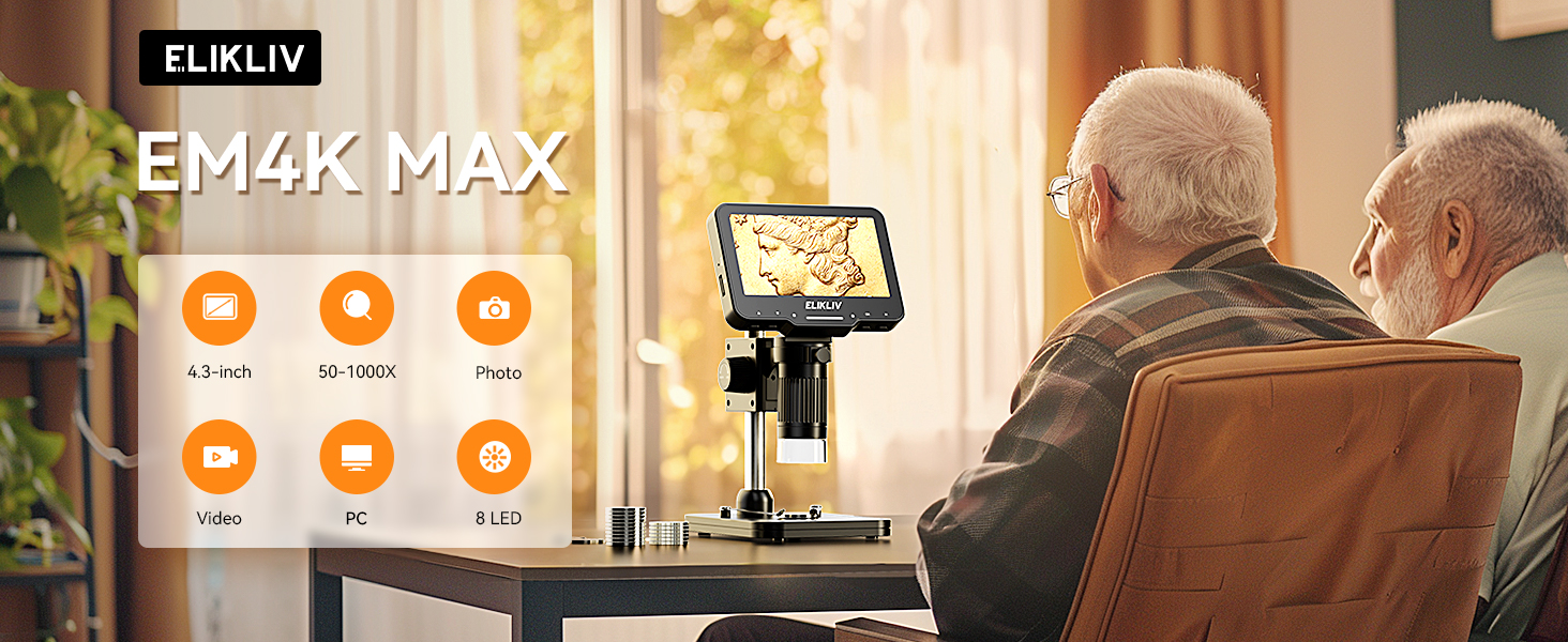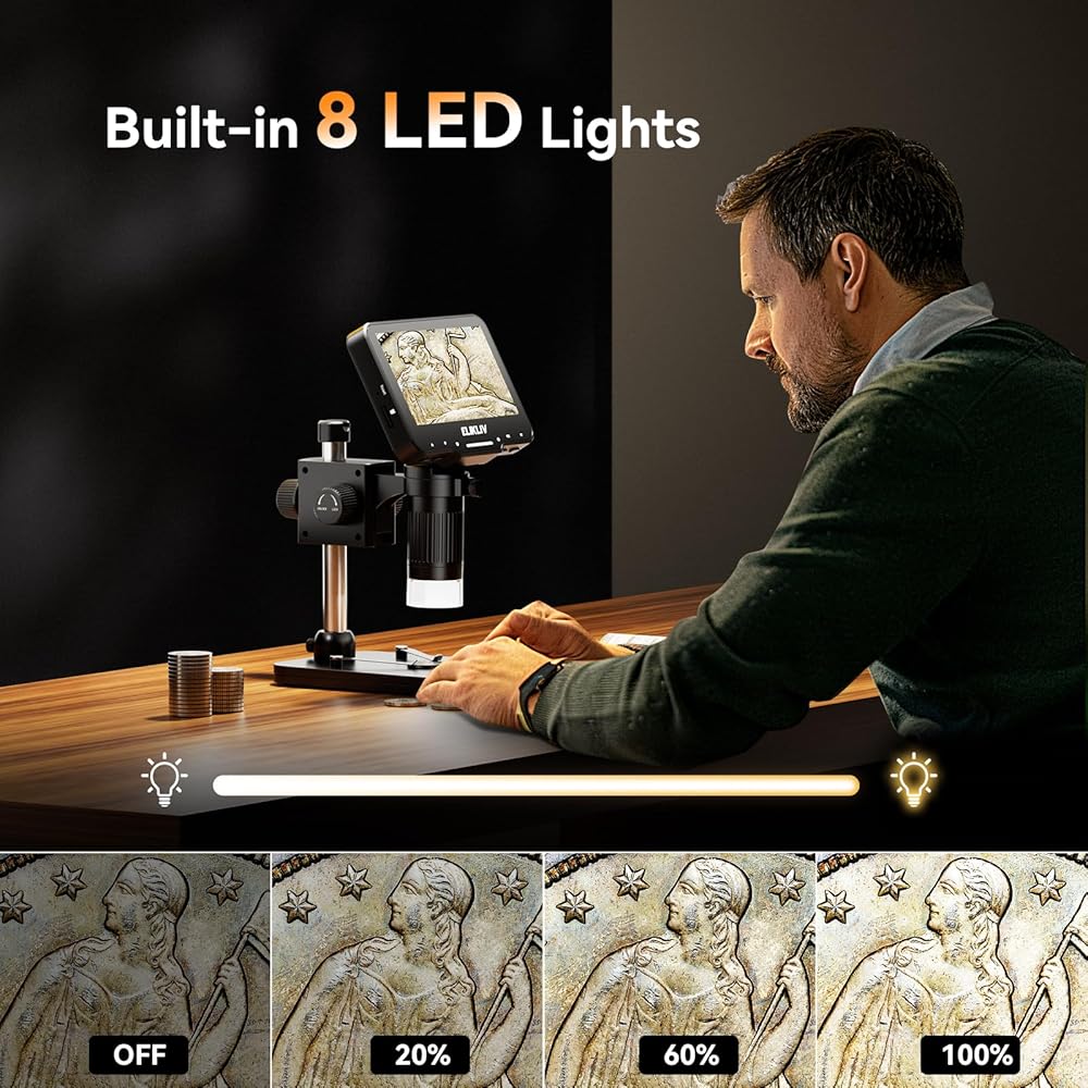 【8 مصابيح LED قابلة للتعديل】تمتع بتجربة الإضاءة المثالية مع مصابيح LED الثمانية القابلة للتعديل في مجهر Elikliv DM4. يمكنك ضبط السطوع بسهولة لضمان الحصول على عينات واضحة ومشرقة، مما يسمح بالتقاط صور ومقاطع فيديو مثالية حتى في المناطق المظلمة أو المشجرة. استمتع بتجربة ممتازة مع مجهر Elikliv DM4.