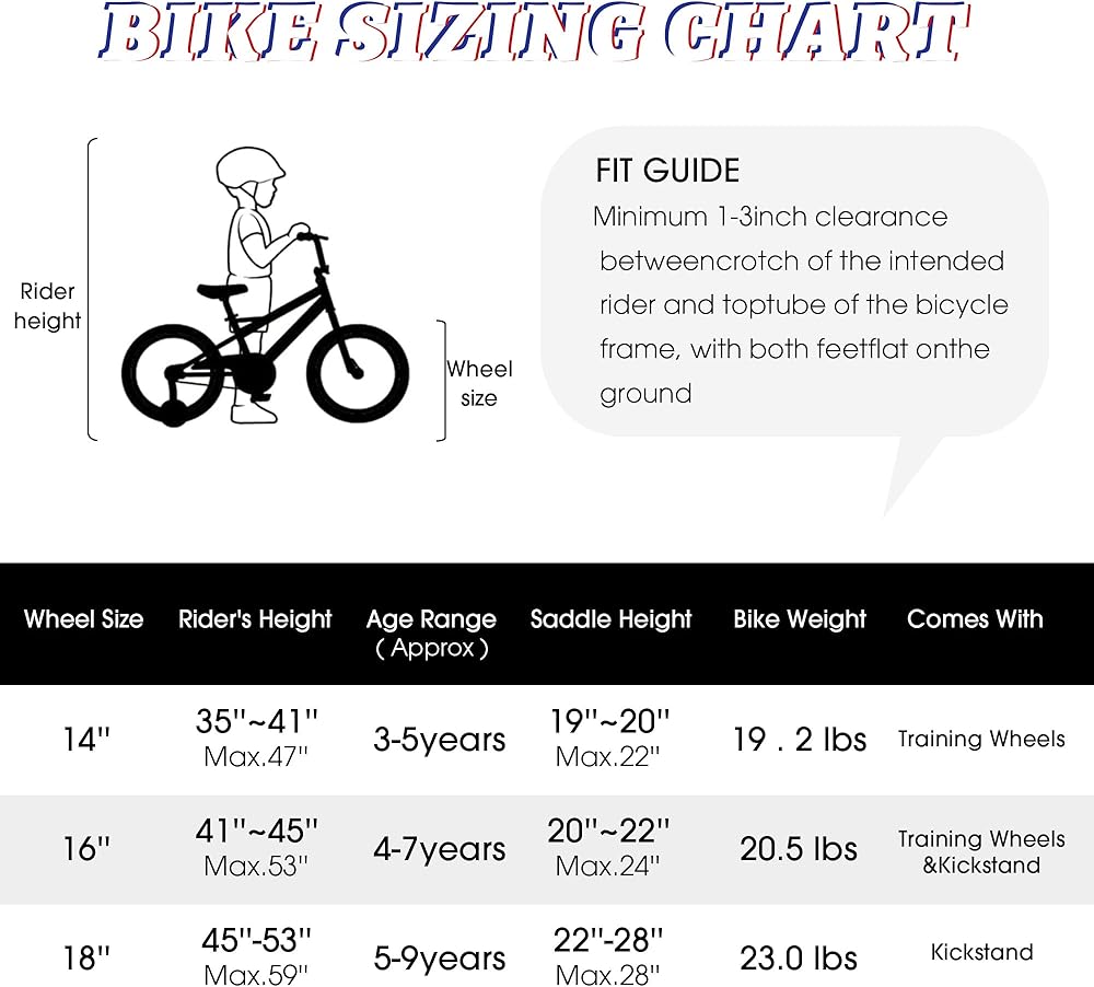توصيات المقاس - دراجة مقاس 12 بوصة للأطفال من 2 إلى 4 سنوات (33 بوصة - 41 بوصة) للأطفال الصغار، دراجة مقاس 14 بوصة للأطفال من 3 إلى 5 سنوات (35 بوصة - 47 بوصة)، دراجة مقاس 16 بوصة للأطفال من 4 إلى 7 سنوات (41 بوصة - 53 بوصة) ") الأولاد والبنات. ملحوظة: قد يختلف طول الطفل، حتى في نفس العمر. يرجى مراعاة الارتفاع عند اختيار الدراجة.