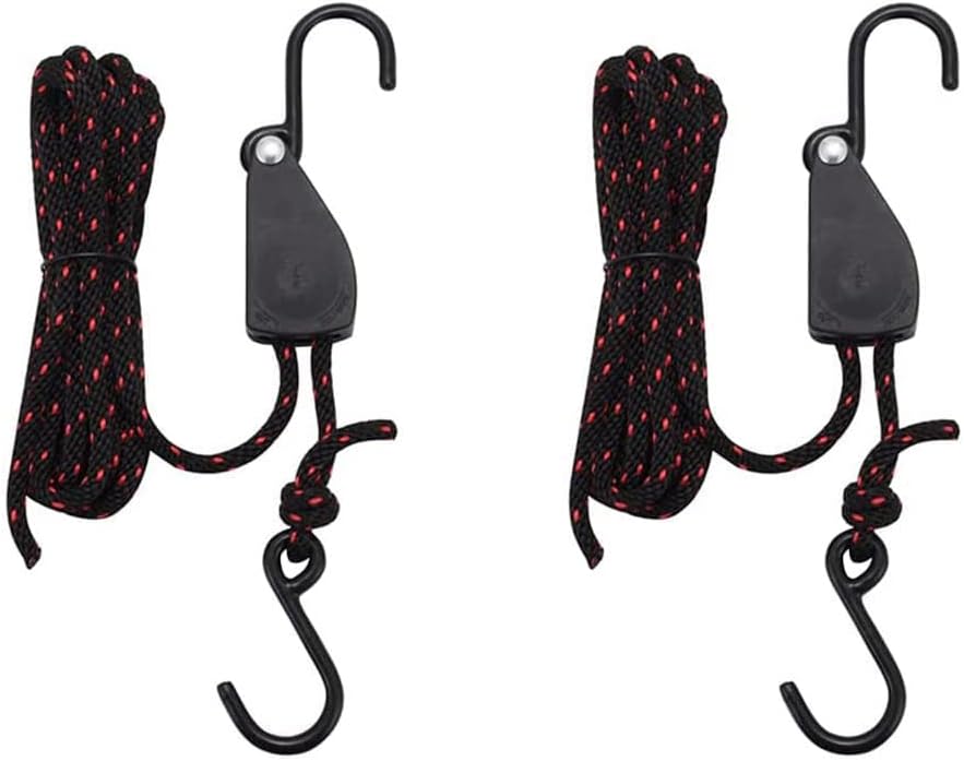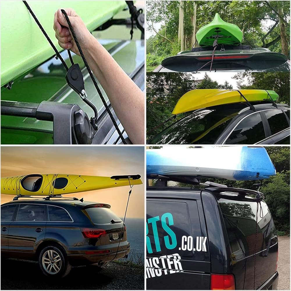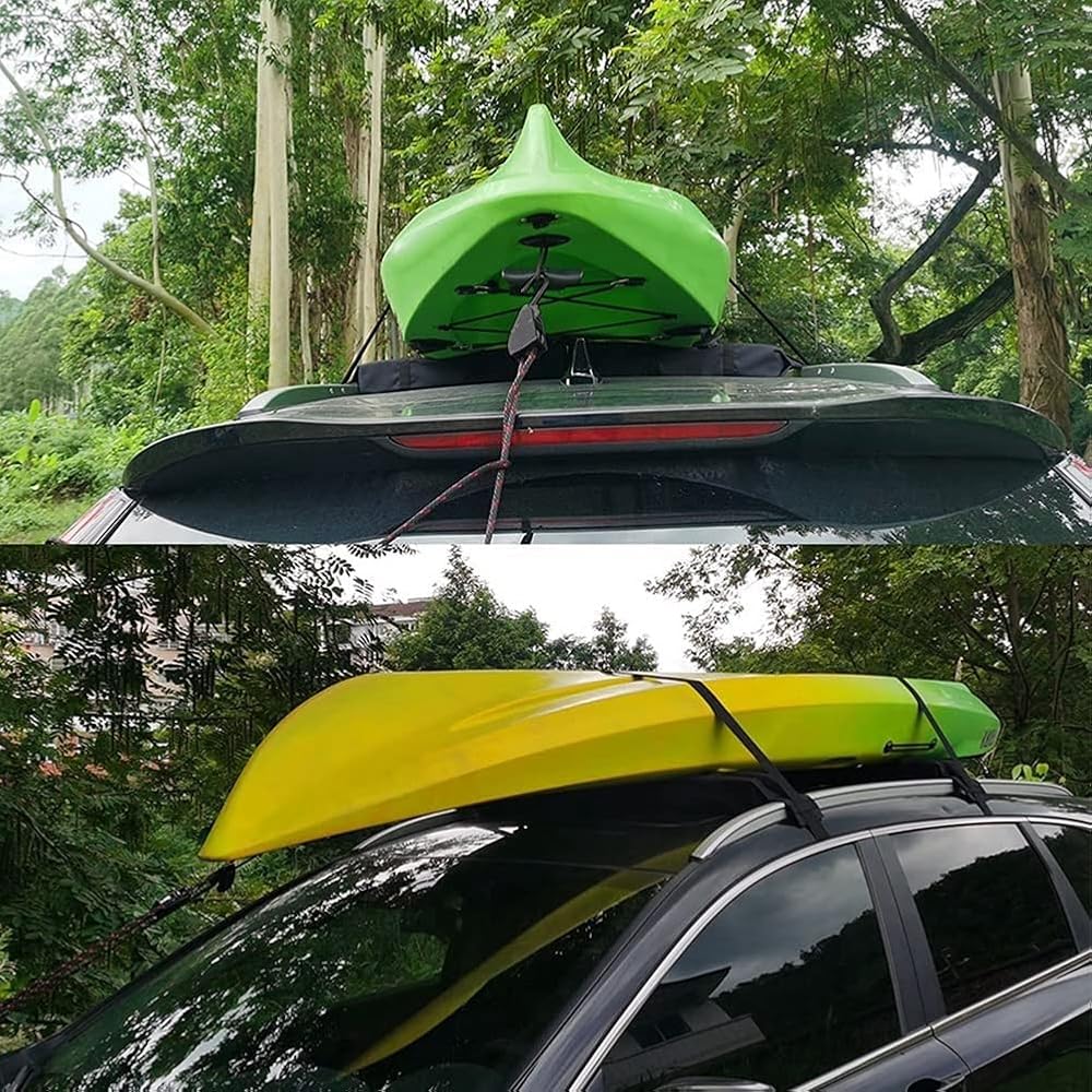 3.STABLE -- Each rope tie down includes 2 pieces of S-shape hooks. You only need to pull the rope tightly and connect the hooks to the points, then it will help you tie down kayak, canoe and others very stably