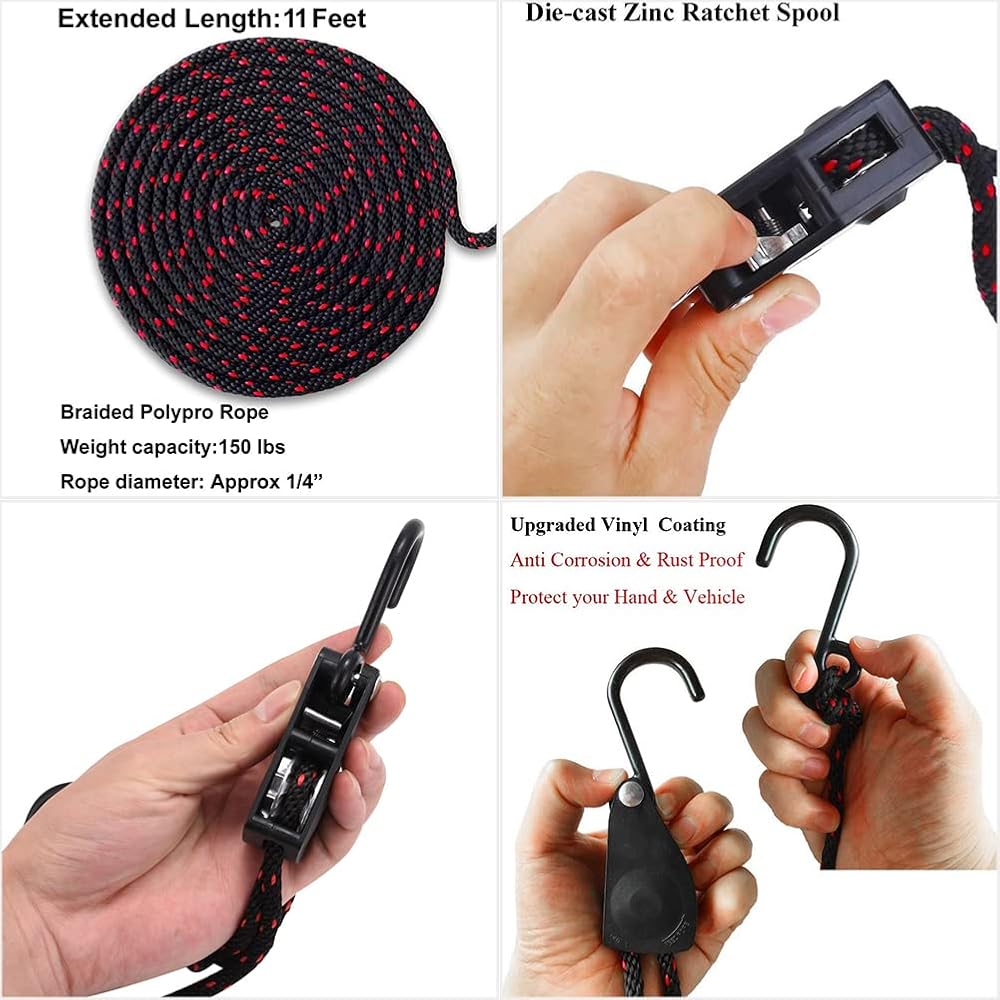2.SAFETY SIZE -- The total length of the rope is 11 feet and adjustable by a ratchet spool; its diameter is 1/4 inch and each tie rope can withstand a load of 75 pounds (150 pounds per pair)