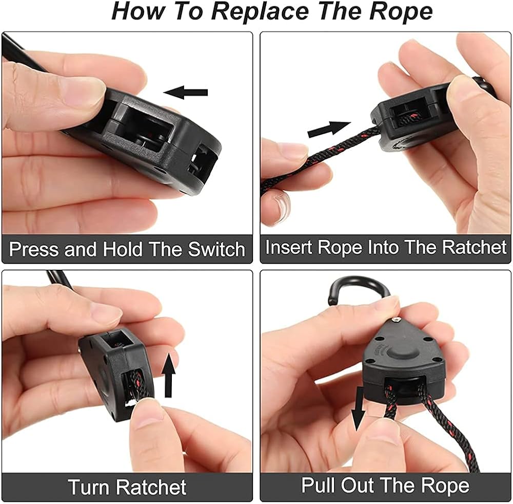 4.EASY TO USE -- The ratchet will automatically tighten the rope securely so that you don't need to worry about. Pushing the thumb release lever with your finger and you can easily release the tension
