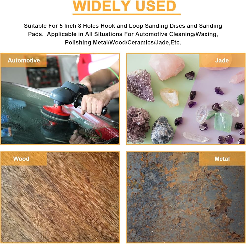 التطبيقات: مجموعة من 5 وسائد عازلة ذات واجهة ناعمة بخطاف وحلقة مناسبة لتلميع المعادن والخشب والسيراميك والزجاج وأسطح السيارات وطلاء القوارب.
