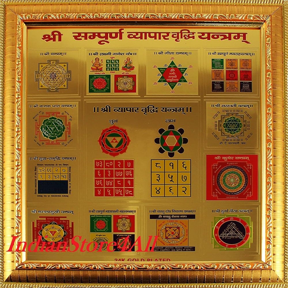The following yantras are included in this Sampoorna Vyapar Vriddhi Maha Yantra : 1. Vyapar Vriddhi Yantra (center) 2. Shree Yantra 3. Sampoorna Maha Lakshmi Yantra 4. Geeta Yantra 5. Navgrah Yantra 6. Kanakdhara Yantra 7. Matsya Yantra 8. Kuber Yantra 9. Vashyankar Yantra 10. Durga Bisa Yantra 11. Vastu Dosha Nivaran Yantra 12. Lakshmi Ganesha Yantra 13. Baglamukhi Yantra