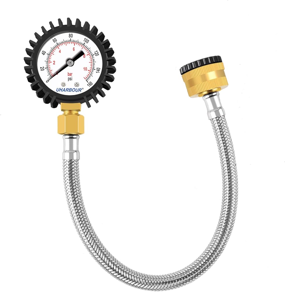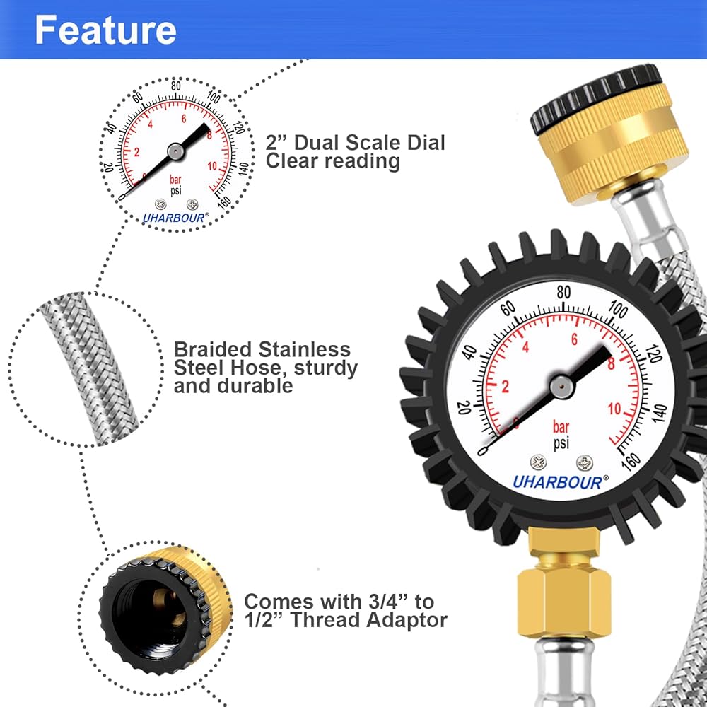 مقياس ضغط المياه، مقياس ضغط المياه للمنزل 2 بوصة، مقياس اختبار ضغط المياه مع خرطوم مضفر من الفولاذ المقاوم للصدأ، نطاق 200 رطل لكل بوصة مربعة، وصلة FNPT 3/4 بوصة
