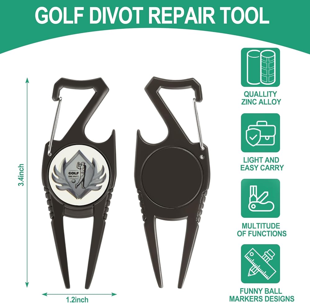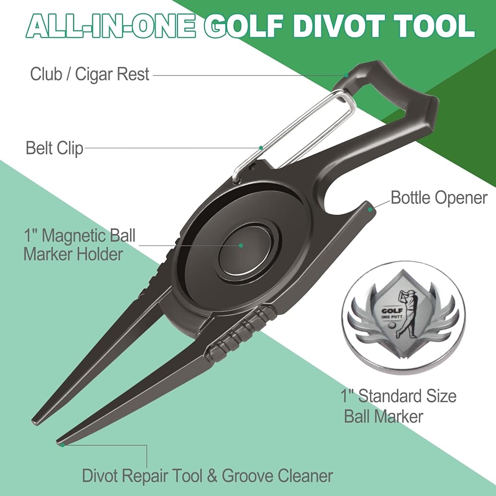 أداة جولف متعددة الوظائف 6 في 1: تجمع أداة جولف ديفوت هذه بين 6 وظائف في واحدة، مما يسمح لك بإصلاح فتحات الجولف، وتنظيف الأخاديد، ووضع علامات على كرات الجولف باستخدام قلم مغناطيسي، وفتح الزجاجات، وتثبيتها على حزامك، دعم نوادي الجولف. إنه يلبي احتياجات لعب الجولف المختلفة ويعزز الراحة بشكل كبير.