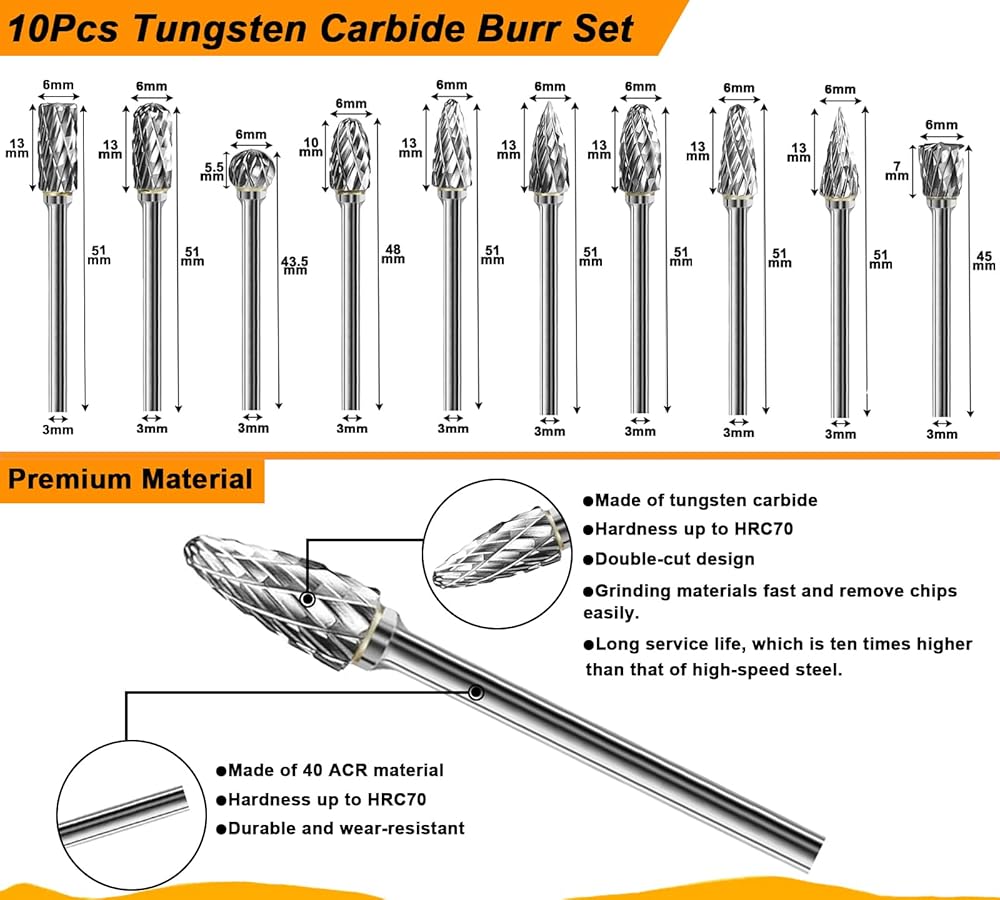 【مجموعة شفرات كربيد التنجستين المكونة من 10 قطع】: يتم وضع المجموعة في علبة بلاستيكية بتصميم مزدوج القطع يمكنه طحن المواد بسرعة وإزالة الرقائق بسهولة، وتحسين كفاءة العمل وتوفير وقتك. مع ساق 1/8 بوصة متوافقة مع دريميل وميلووكي ومعظم الأدوات الدوارة الصغيرة مع ثلاثة فكين، ممتازة للمعادن والخشب والبلاستيك والحجر والزجاج والسيراميك وما إلى ذلك.