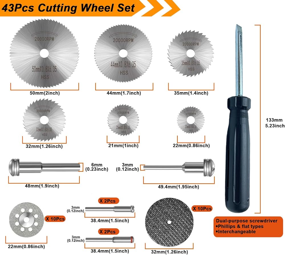 【مجموعة عجلات القطع 43 قطعة】: المجموعة ذات ساق 1/8 بوصة تتضمن أقراص قطع من الراتنج، وشفرات منشار دائري HSS، وعجلات قطع الماس ومفك براغي مزدوج الأغراض، أداة رائعة للاستخدام الشخصي ومتوافقة مع معظم الأدوات الدوارة الكهربائية، مثالية لـ قطع الخشب والبلاستيك والأحجار الكريمة والزجاج وسبائك الألومنيوم واليشم.