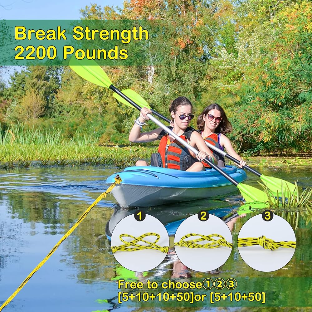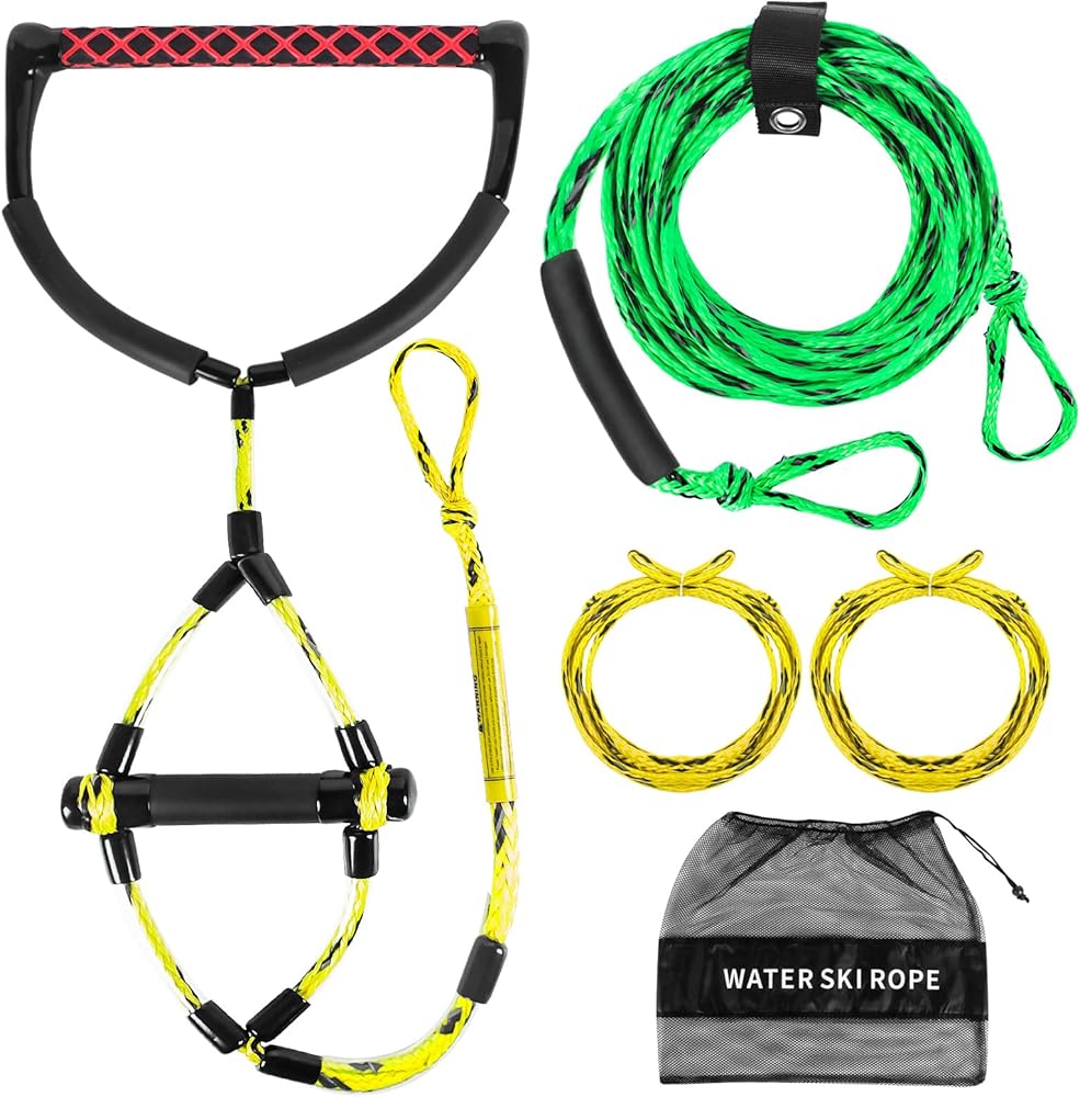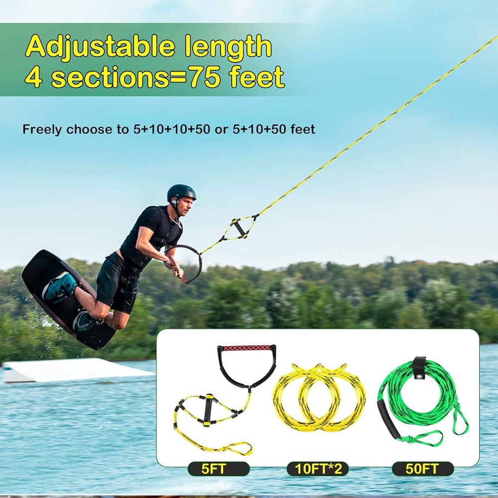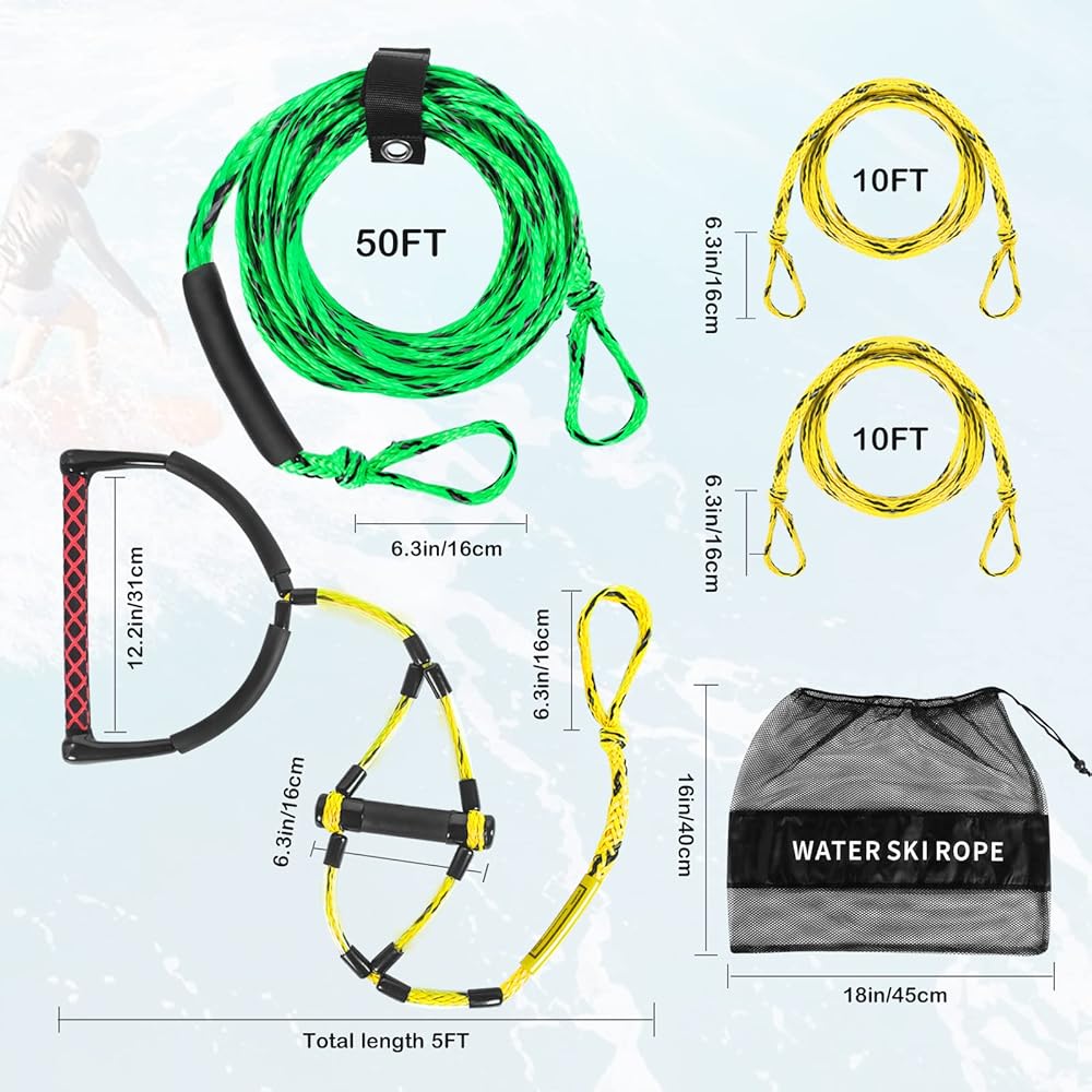 - OR Heavy duty 4 section performance water ski rope,which is made up of one 50-foot take-off rope, two 10-foot take-off rope, and one 5-foot handle rein.