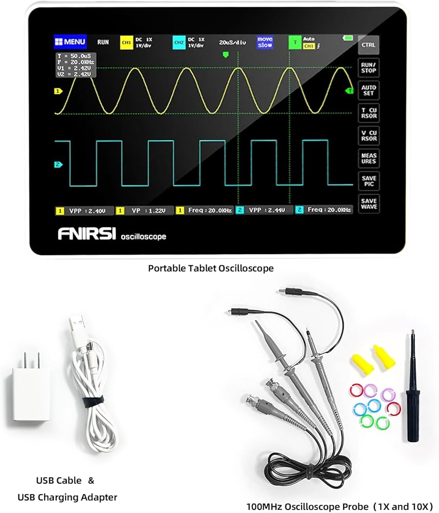 راسم الذبذبات الرقمي للكمبيوتر اللوحي 100 ميجا هرتز عرض النطاق الترددي، مجموعة راسم الذبذبات الرقمية المحمولة للتخزين 2 قناة، معدل أخذ العينات 1GSa/s، شاشة لمس TFT LCD مقاس 7 بوصات