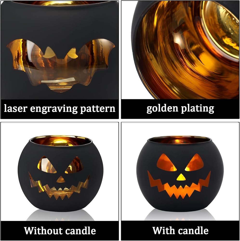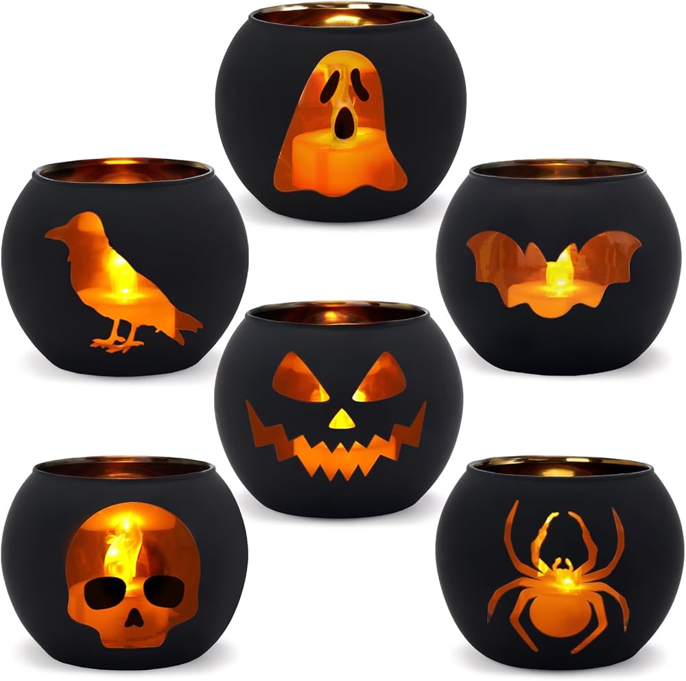 حوامل شموع الهالوين القوطية - تتضمن العبوة 6 قطع من شموع الشموع الزجاجية السوداء في 6 تصميمات مختلفة الأنماط. مزينة كقطع مركزية للطاولة أو كحامل شموع نذرية لإضافة متعة الهالوين إلى منزلك في العطلة.