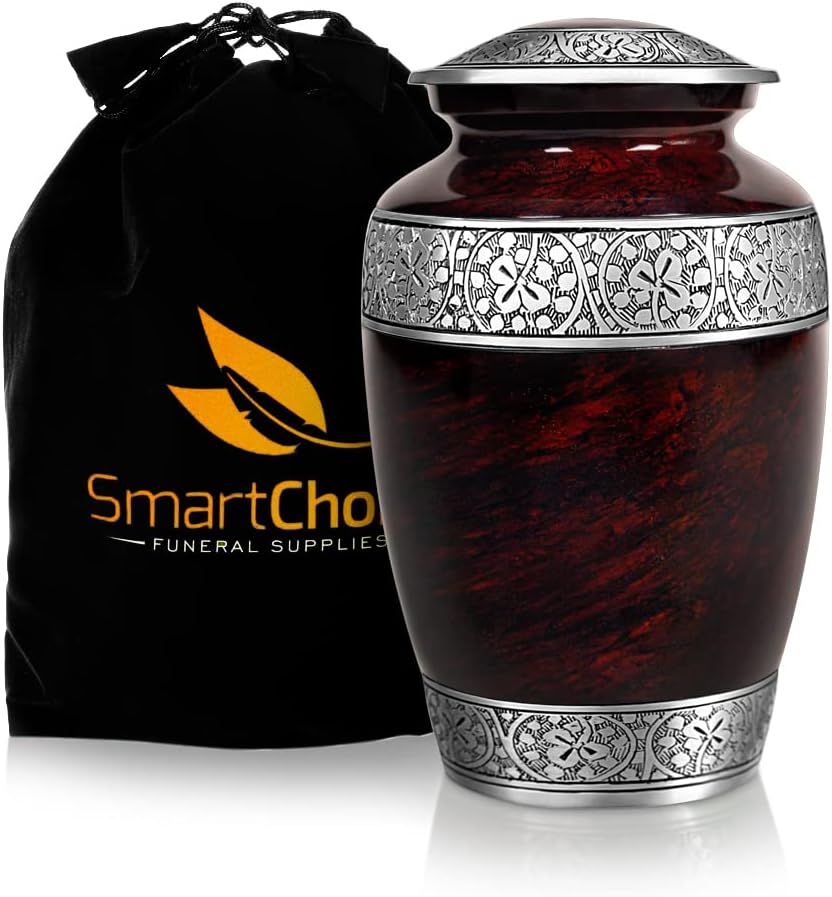 Are you looking for a cremation urn that will truly honor the memory of your loved one? Searching for a burial urn for human ashes that will hold adult human ashes while simultaneously not be an eyesore? Are you searching for a memorial cremation urn that will ensure that your loved one's ashes are safe and sound? This SmartChoice decorative urn is a cremation urn for human adult ashes. This means that the urn can hold the ashes for any adult and has a capacity of roughly 200 cubic inches. This vase for ashes is made of metal and provides a strong and durable finish to the final resting place of your loved one. This human ash urn is made so that it will provide a secure resting place to your loved one and provide you with the secure knowledge that your loved one is resting in a good place. The timeless design is made to get along with any of your home or office décor and will definitely prove not to be an eyesore. The urn further provides a unique resting place and ensures that you know exactly where your loved one's ashes are at all times. You can also be sure that this urn won't ruin the surface of the furniture you put this urn on as it has a felt base which will protect the base of the urn as well as the urn's resting place. Your loved one's ashes are securely fastened with a handcrafted, tight-fitting, threaded lid. Package Includes: 1 x Cremation Urn 1 x Velvet Bag