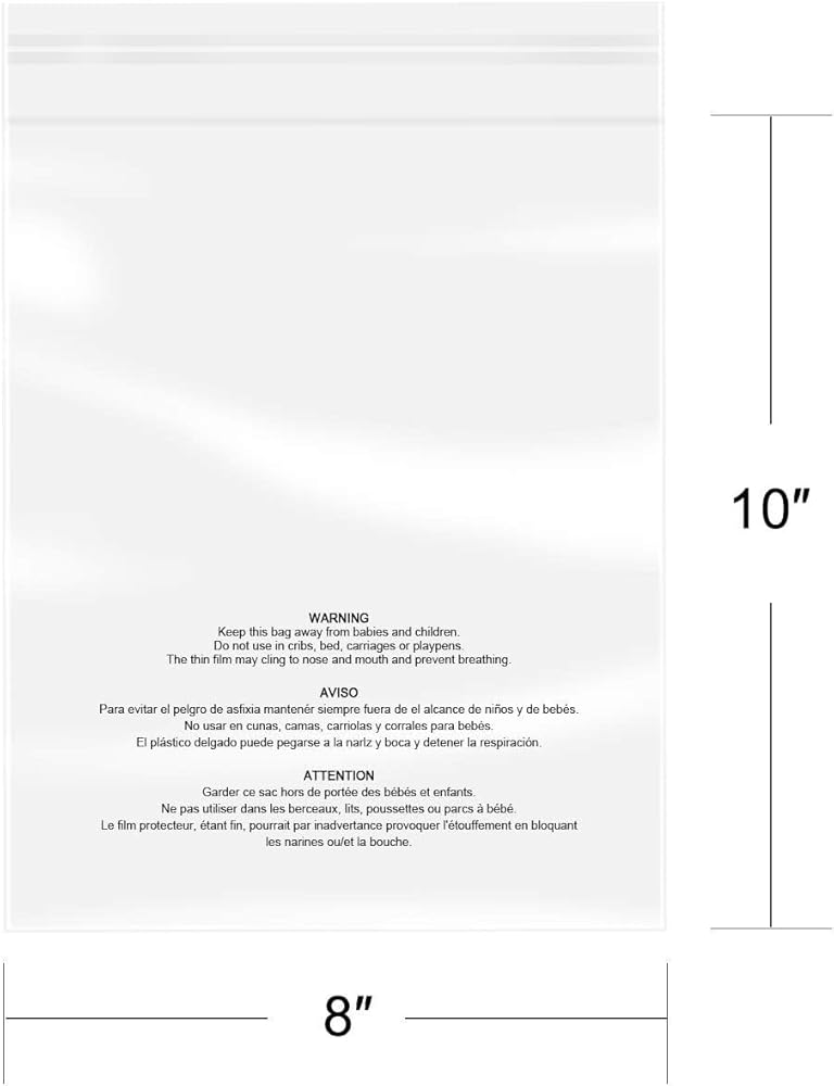 [Product Feature]- 100 Pcs - 8" x 10" Usable Dimension (Excludes Glue Flap). 1.6 Mil Thickness self-seal Clear Poly Bags Printed with Suffocation Warning.