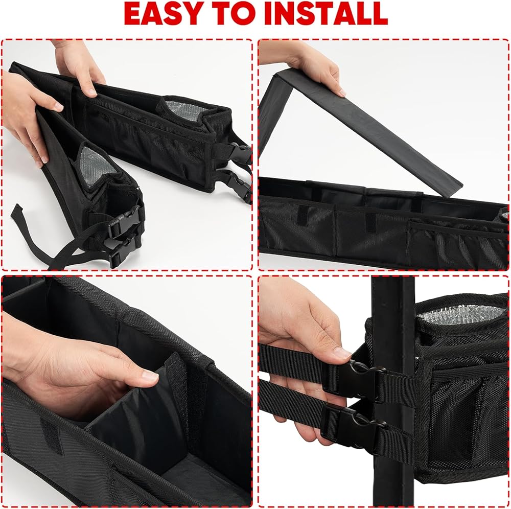 【سهلة التركيب】: لا حاجة للثقب. يتميز كل جانب من سلة التخزين بحزامين بإبزيم قابلين للتعديل للتثبيت الآمن، وتسهيل التركيب السهل والسريع.