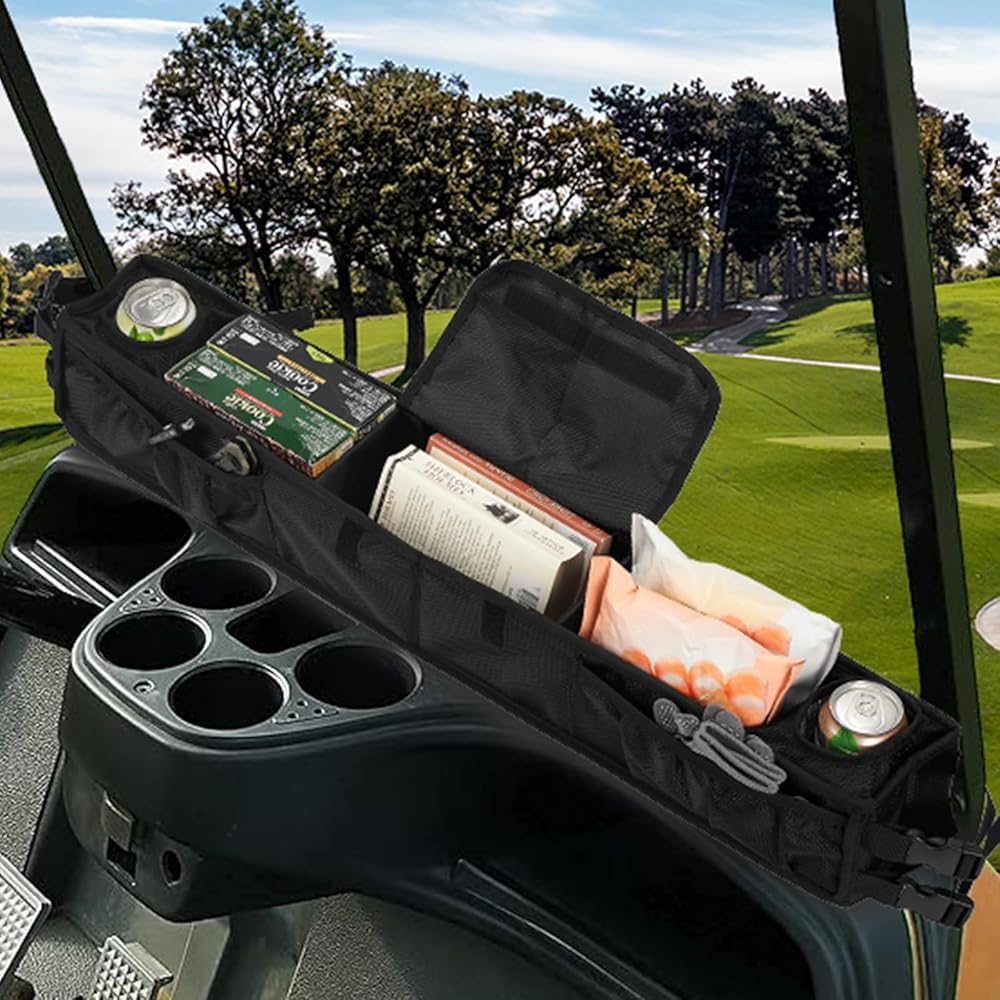 سلة تخزين داخلية أمامية لعربة الجولف مع حاملات أكواب معزولة، بدون حفر، منظم صينية لوحة القيادة قابل للطي عالمي متوافق مع EZGO، Club Car، نموذج Kandi Electirc