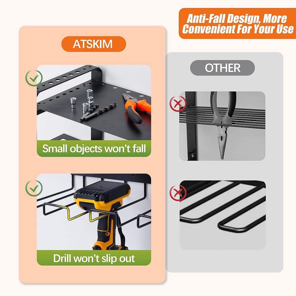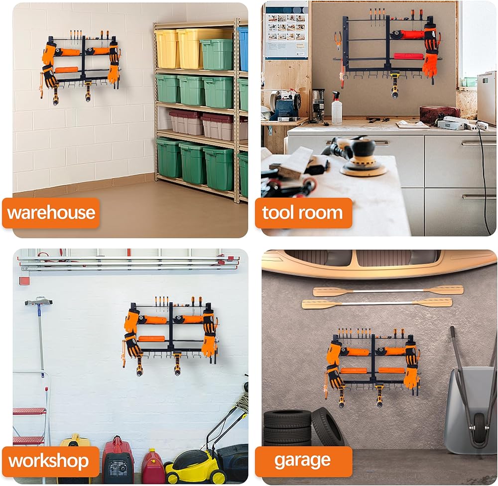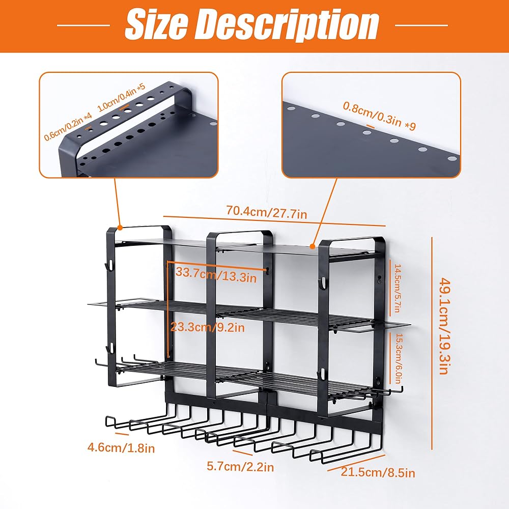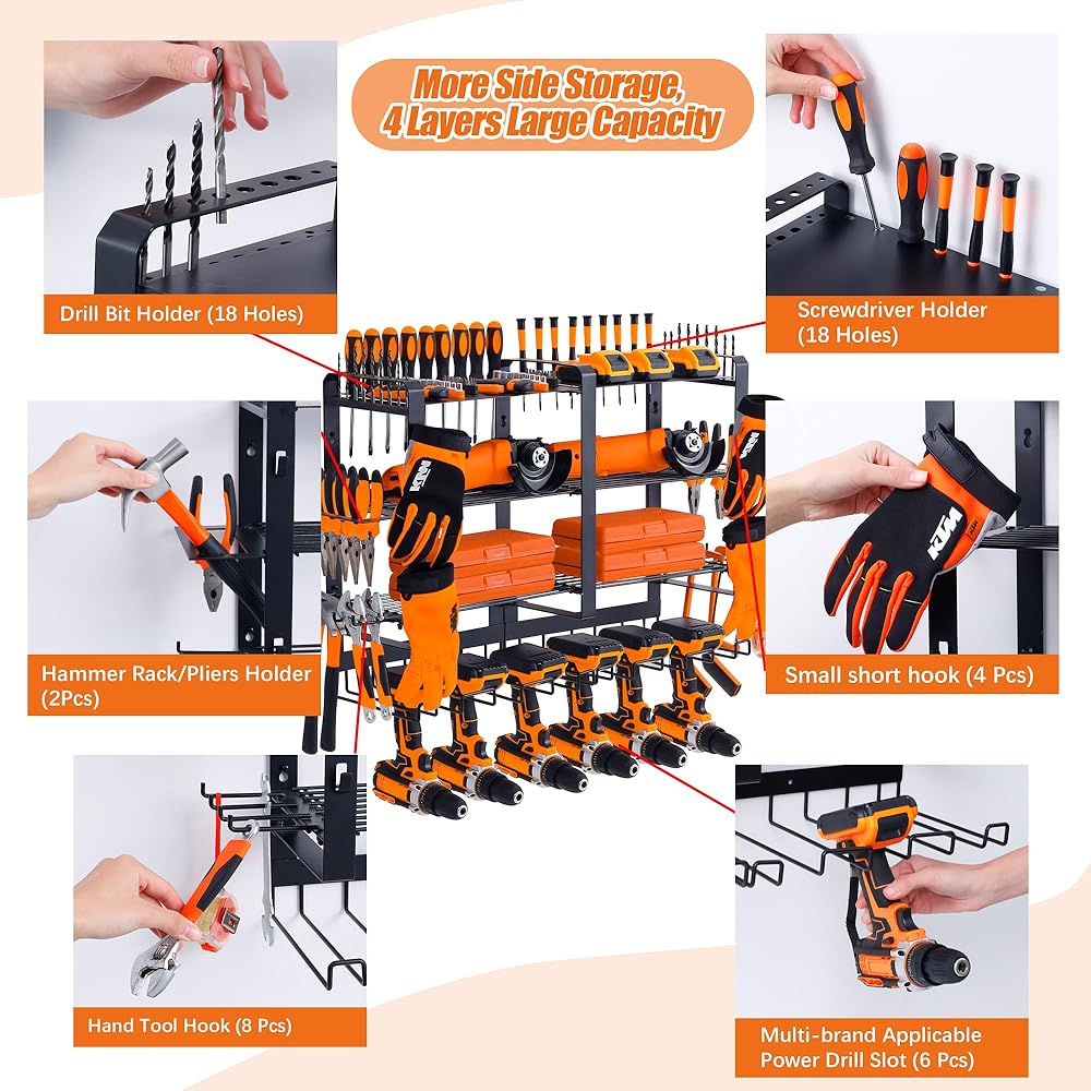 【المزيد من الأماكن للتخزين على الجانب】 منظم أدوات طاقة كبير مع حامل لقم الثقب، وحامل كماشة، وحامل مطرقة، وحامل مفك براغي على الجانب، وخطافات طويلة وقصيرة للمفكات، وشريط قياس، وقفازات، تساعدك على وضع المزيد من الأدوات الصغيرة. . تصميم هيكل من 4 طبقات، يمكن للجزء السفلي من رف الأدوات الكهربائية حمل 6 مثقاب لاسلكي، والطبقات الثلاثة العلوية يمكن أن تحمل أدوات كبيرة شديدة التحمل، وتساعدك على التخزين بكفاءة.