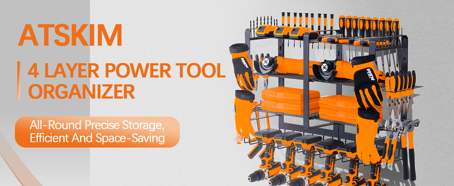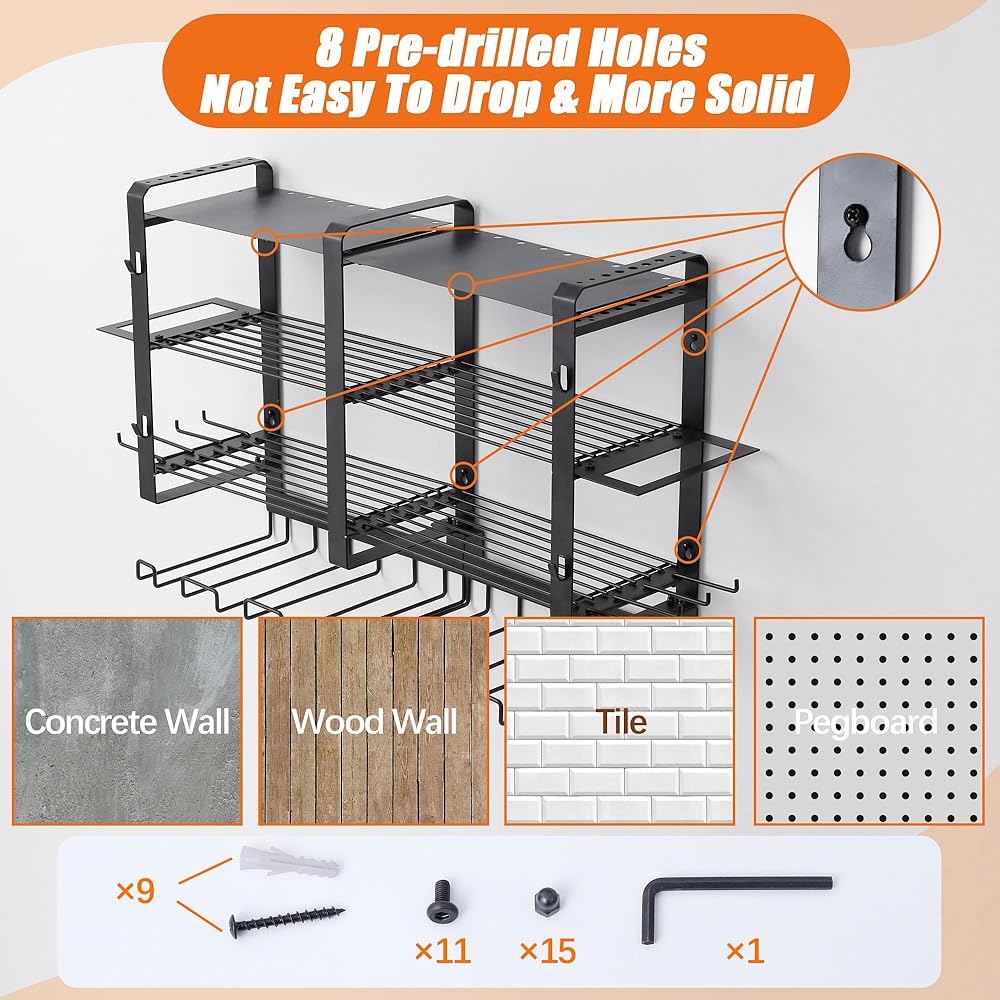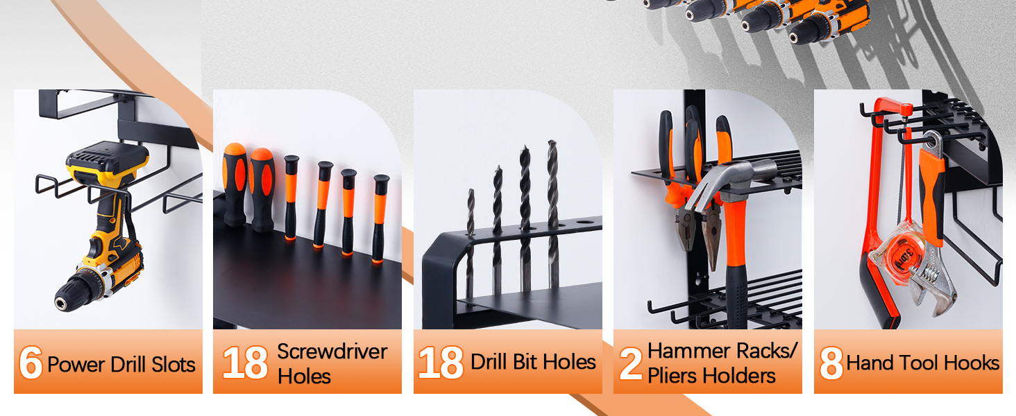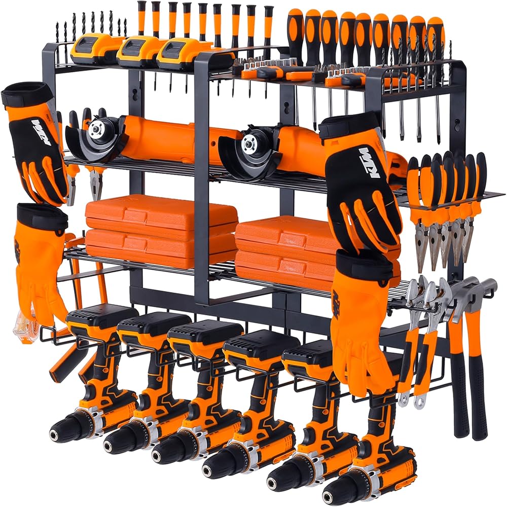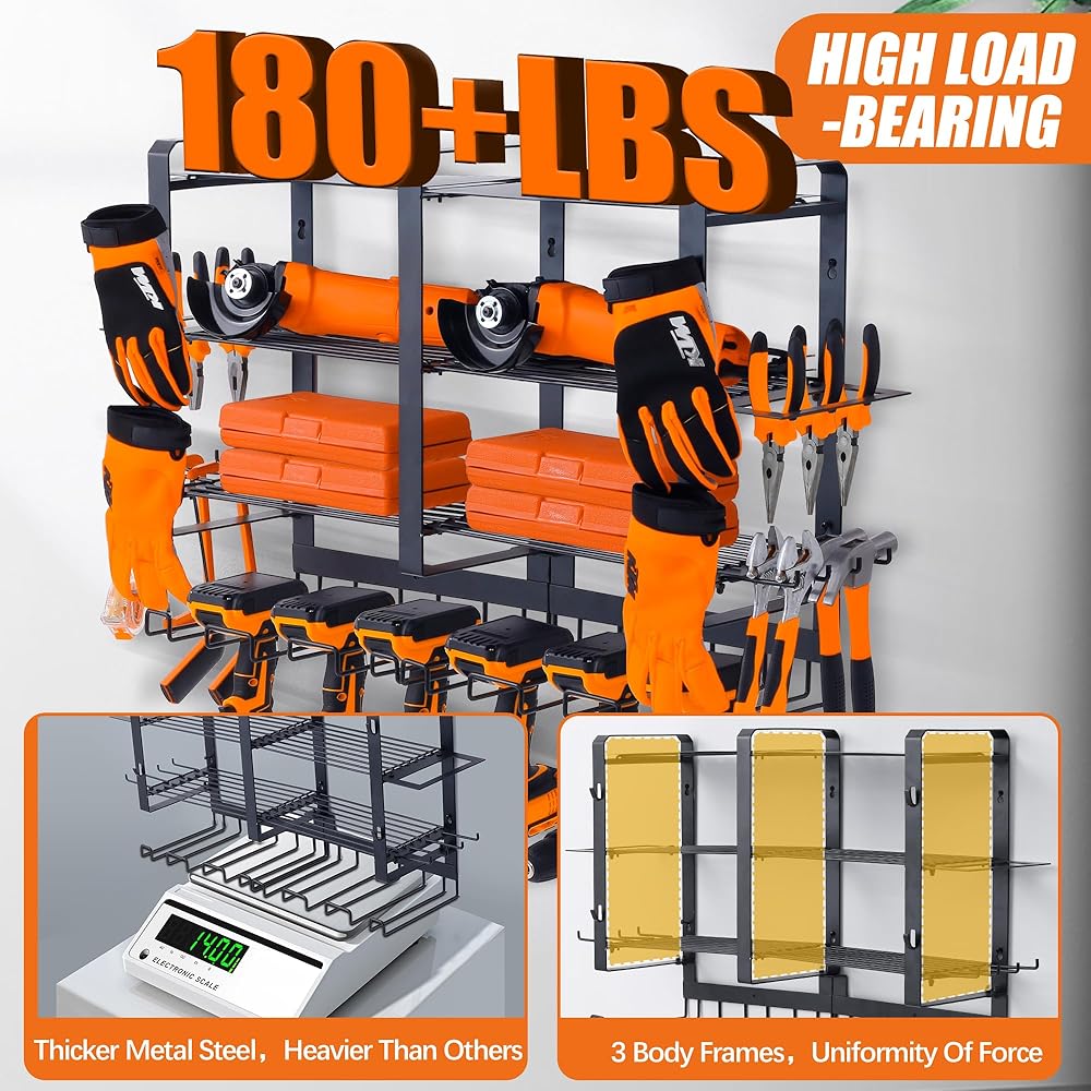 【المزيد من الأماكن للتخزين على الجانب】 منظم أدوات طاقة كبير مع حامل لقم الثقب، وحامل كماشة، وحامل مطرقة، وحامل مفك براغي على الجانب، وخطافات طويلة وقصيرة للمفكات، وشريط قياس، وقفازات، تساعدك على وضع المزيد من الأدوات الصغيرة. . تصميم هيكل من 4 طبقات، يمكن للجزء السفلي من رف الأدوات الكهربائية حمل 6 مثقاب لاسلكي، والطبقات الثلاثة العلوية يمكن أن تحمل أدوات كبيرة شديدة التحمل، وتساعدك على التخزين بكفاءة.
