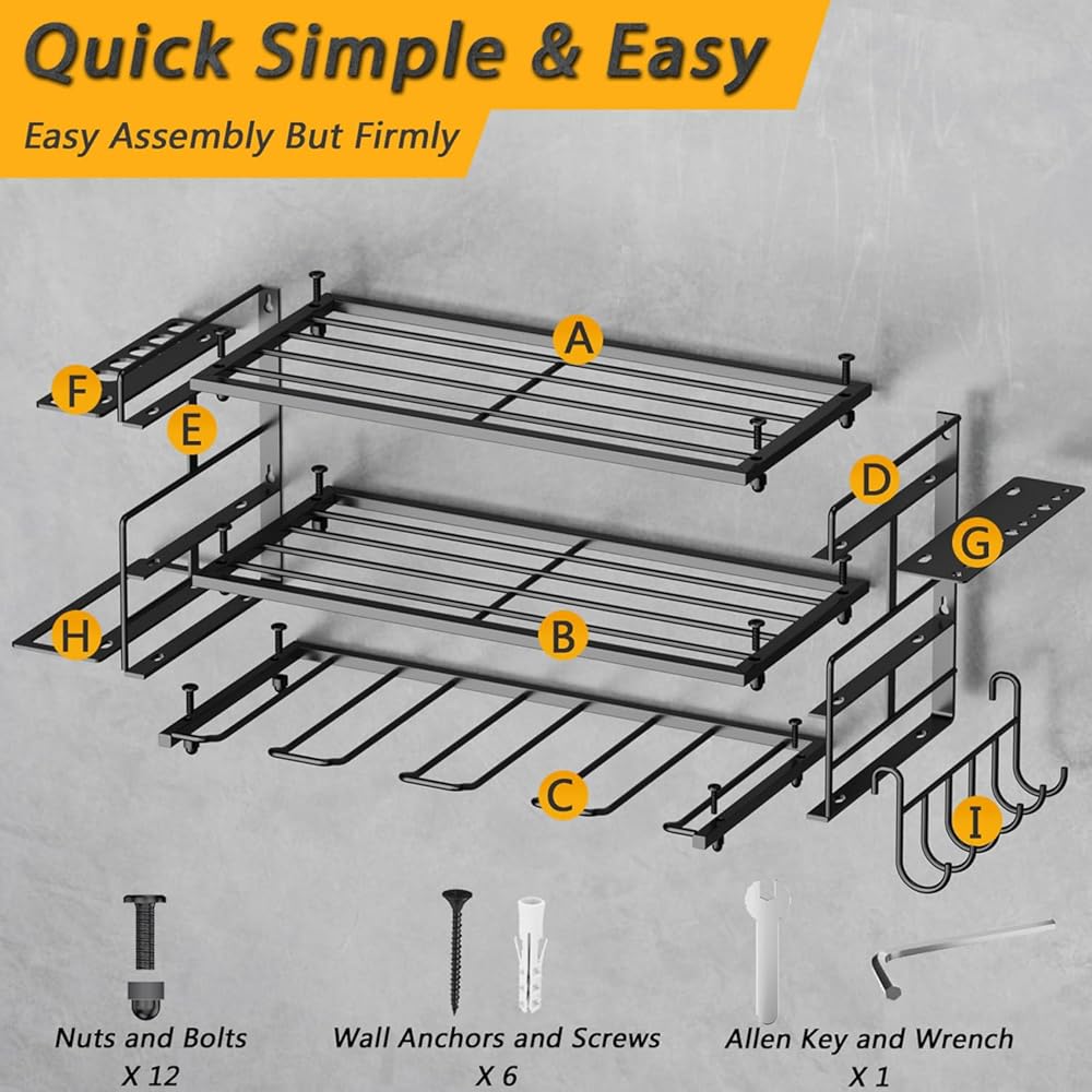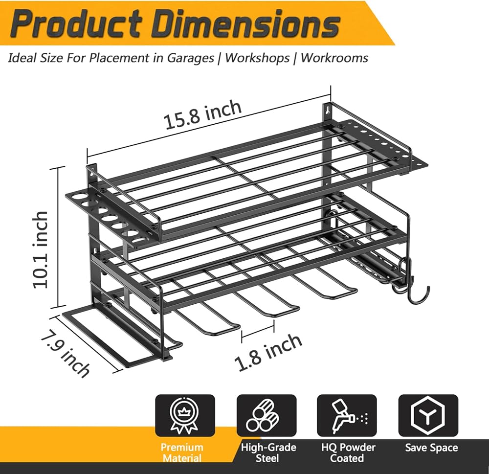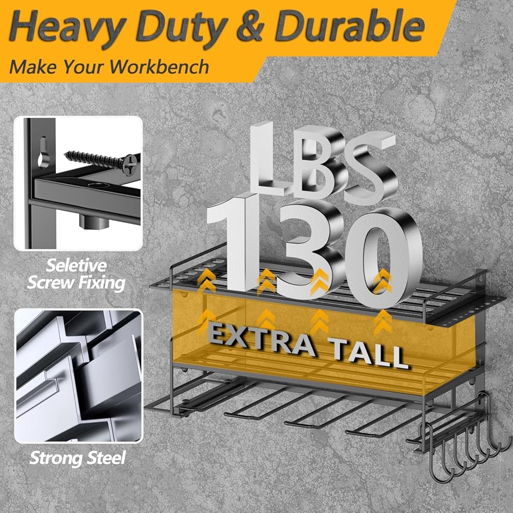 شديدة التحمل ومتينة - مصنوعة من الفولاذ الصناعي ومعززة بمسامير تثبيت عالية الجودة لزيادة سعة الوزن والمتانة. سيساعدك رف الأدوات الكهربائية المصمم للخدمة الشاقة على تحميل الأدوات التي يصل وزنها إلى 150 رطلاً مع جميع أدوات التثبيت الأربعة المثبتة على الحائط. طبقة مرشوشة بعد التيار الكهربائي، فإن تخزين الأدوات لدينا يوفر مقاومة أكبر للتآكل.