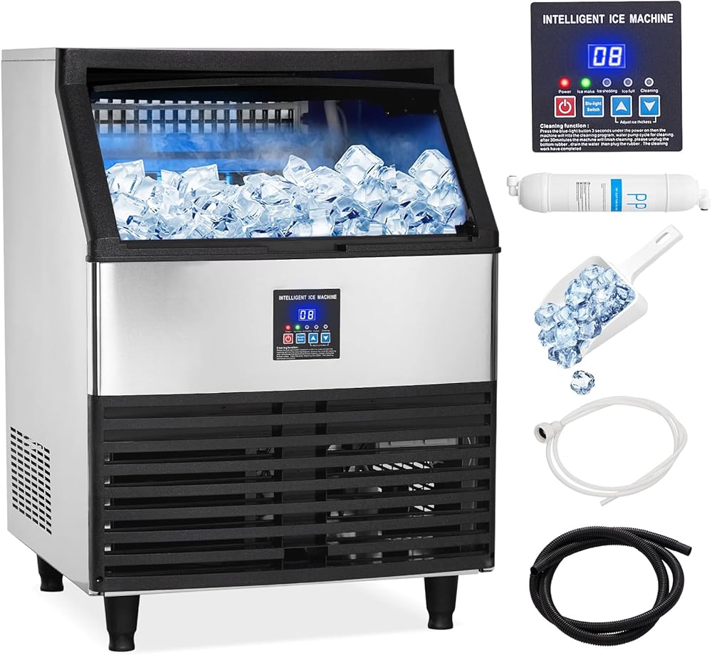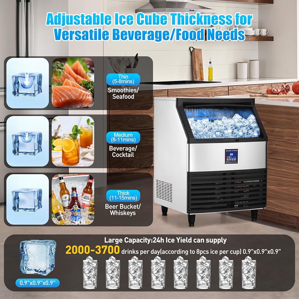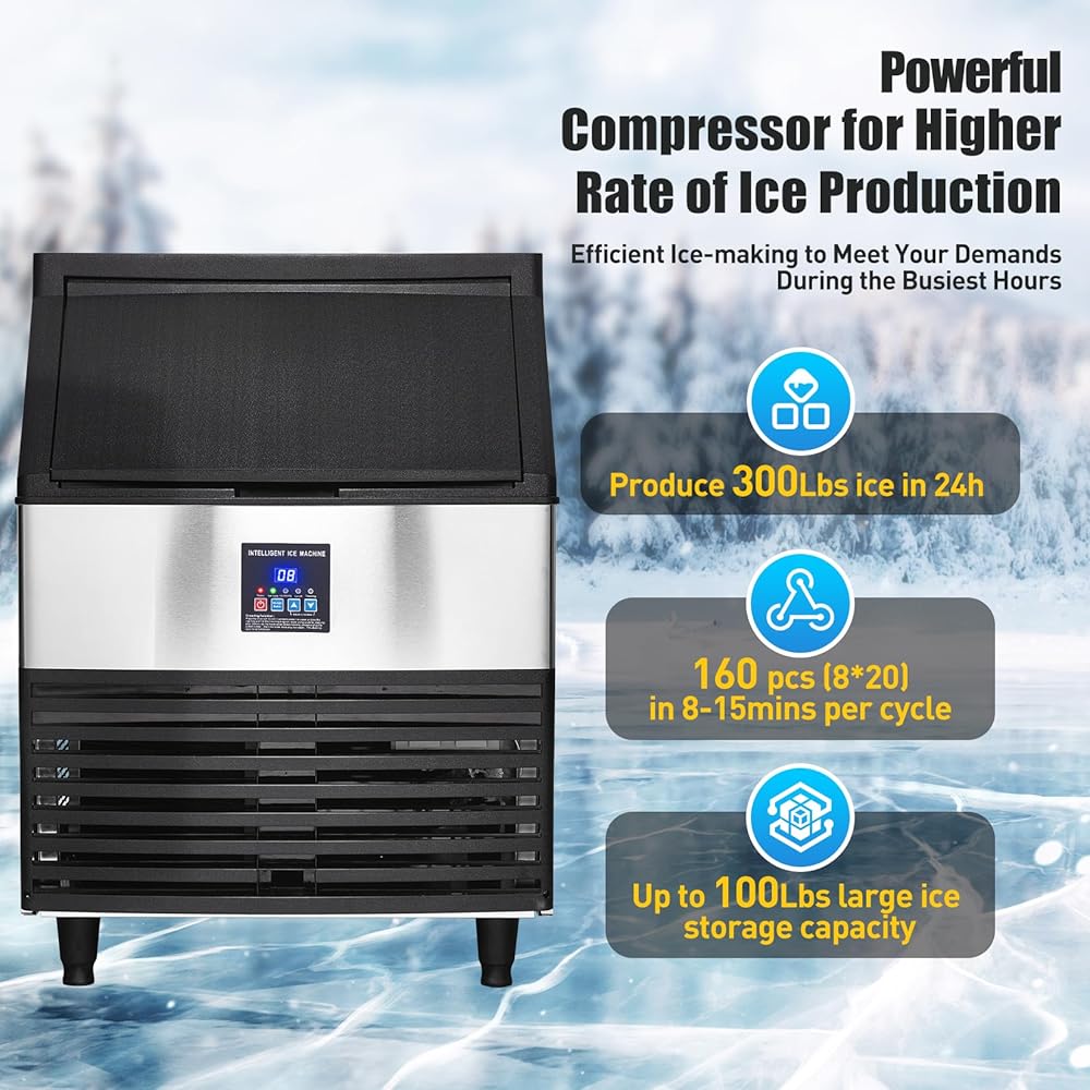 مكعبات الثلج الشفافة: تتميز ماكينة صنع الثلج التجارية هذه بضاغط قوي بقدرة 500 وات، وتوفر قدرة إنتاج ثلج تبلغ 300 رطل/24 ساعة، مع سعة تخزين ثلج واسعة تبلغ 100 رطل (45 كجم) وصينية ثلج مقاس 8 × 20. تعمل وظيفة العزل بكفاءة على منع ذوبان مكعبات الثلج لمدة 6-8 ساعات، مما يضمن إمدادًا مستمرًا بالثلج.