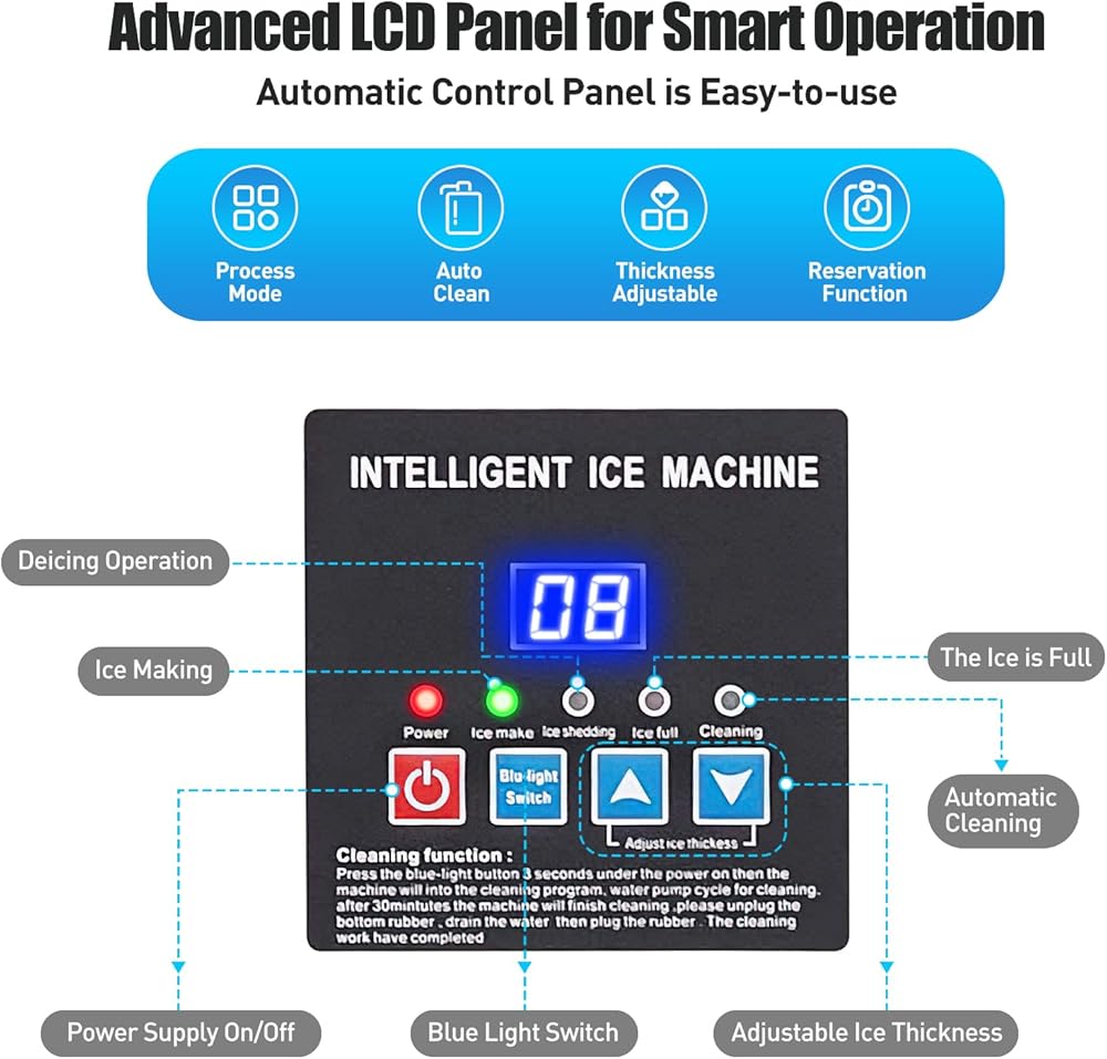 لوحة تحكم سهلة الاستخدام: تسمح لوحة التحكم سهلة الاستخدام بتعديل بسيط لحجم مكعب الثلج وتتميز بوظيفة التنظيف التلقائي بزر واحد. مثالي للإعدادات عالية الطلب مثل المطاعم والحانات والفنادق ومحلات الشاي.