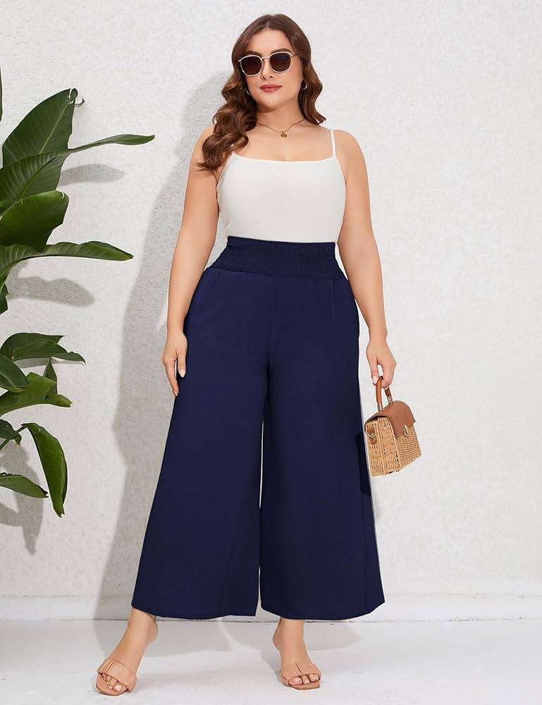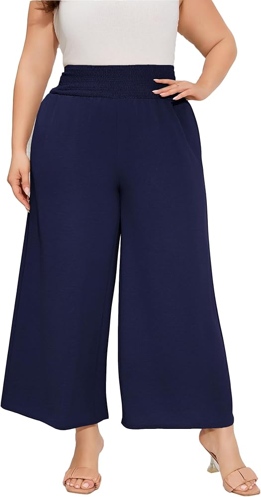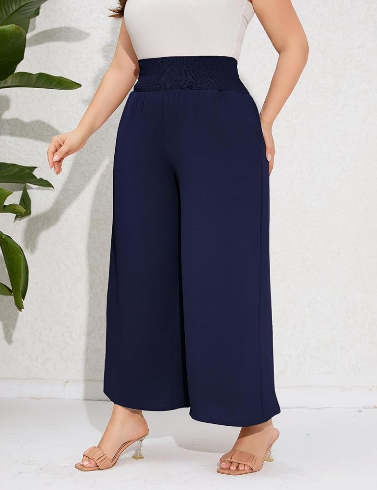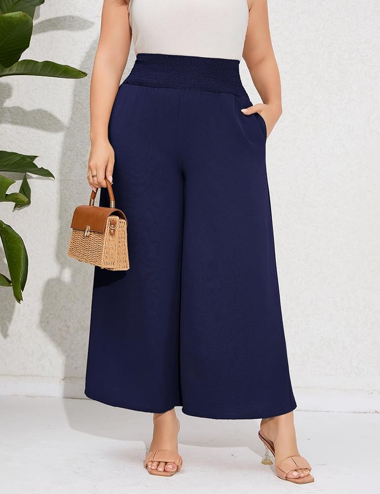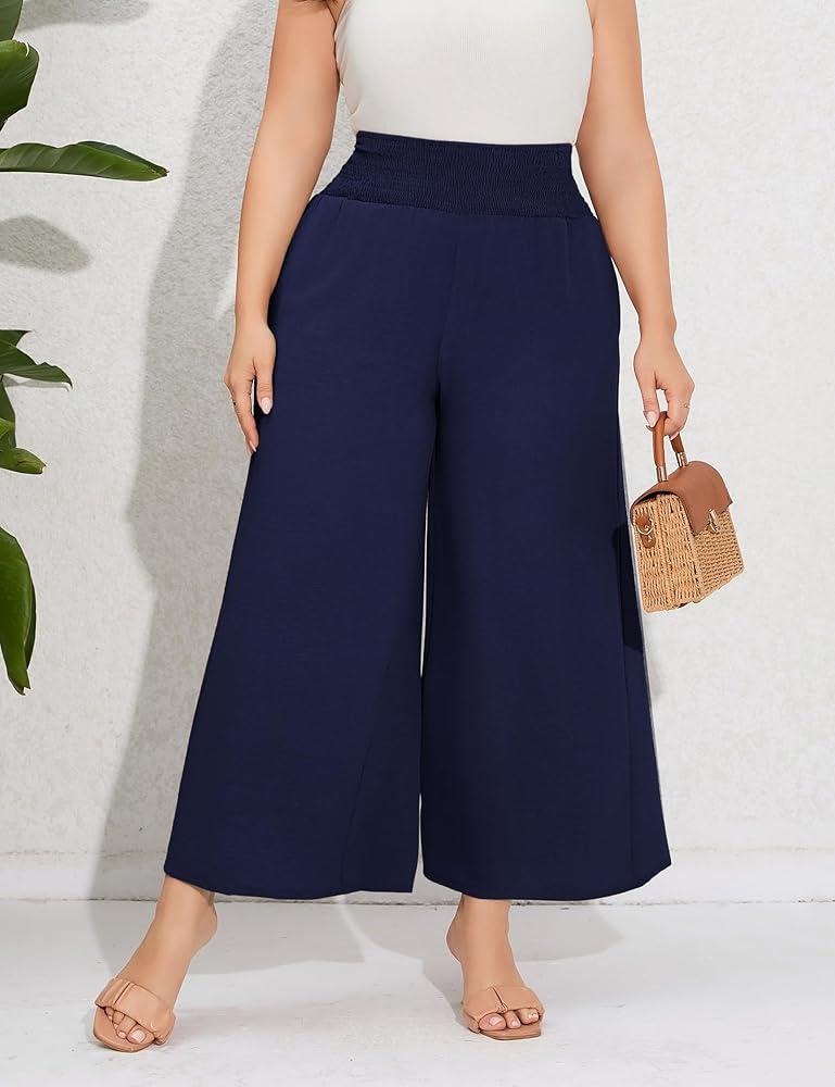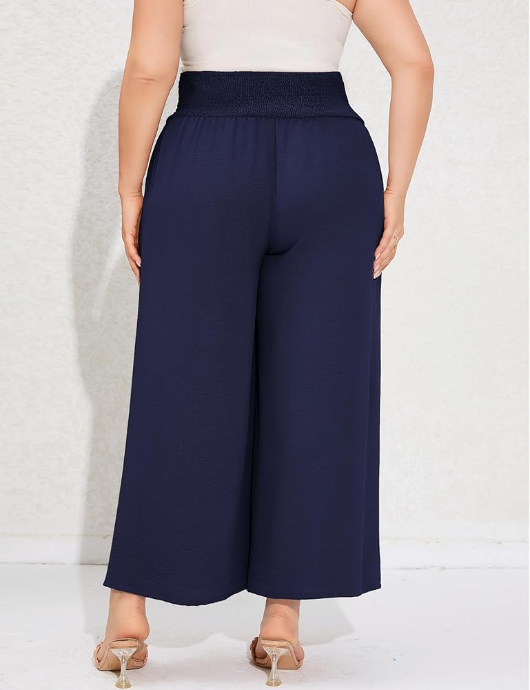 سراويل تقليدية مقاس كبير للنساء سراويل مرنة عالية الخصر واسعة الساق مريحة صالة بوهو سراويل صيفية مع جيوب أزرق داكن XL