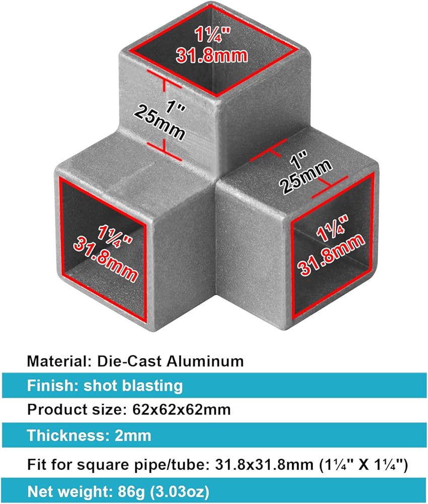 - تطبيق لأنبوب مربع OD مقاس 1-1/4 × 1-1/4 × 1-1/4 بوصة (31.8 × 31.8 × 31.8 مم) لإنشاء اتصال زاوية قائمة بزاوية 90 درجة.