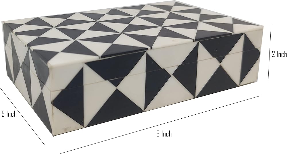 Measuring at a compact 8x5x2 inches, this box offers ample space to keep your jewelry organized and easily accessible. Its timeless black and white design adds a touch of sophistication to any dresser, vanity, or bedside table, enhancing the aesthetic appeal of your space.