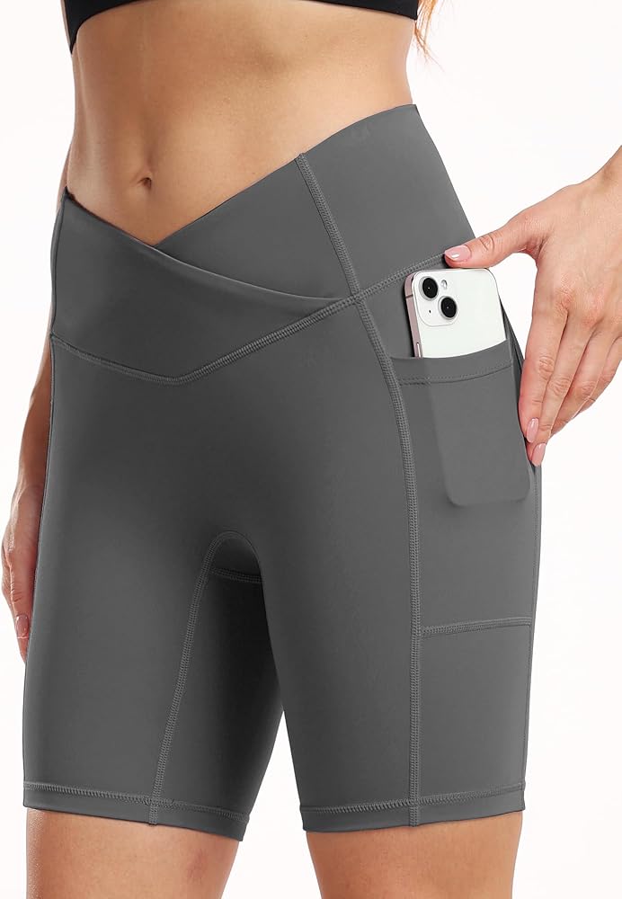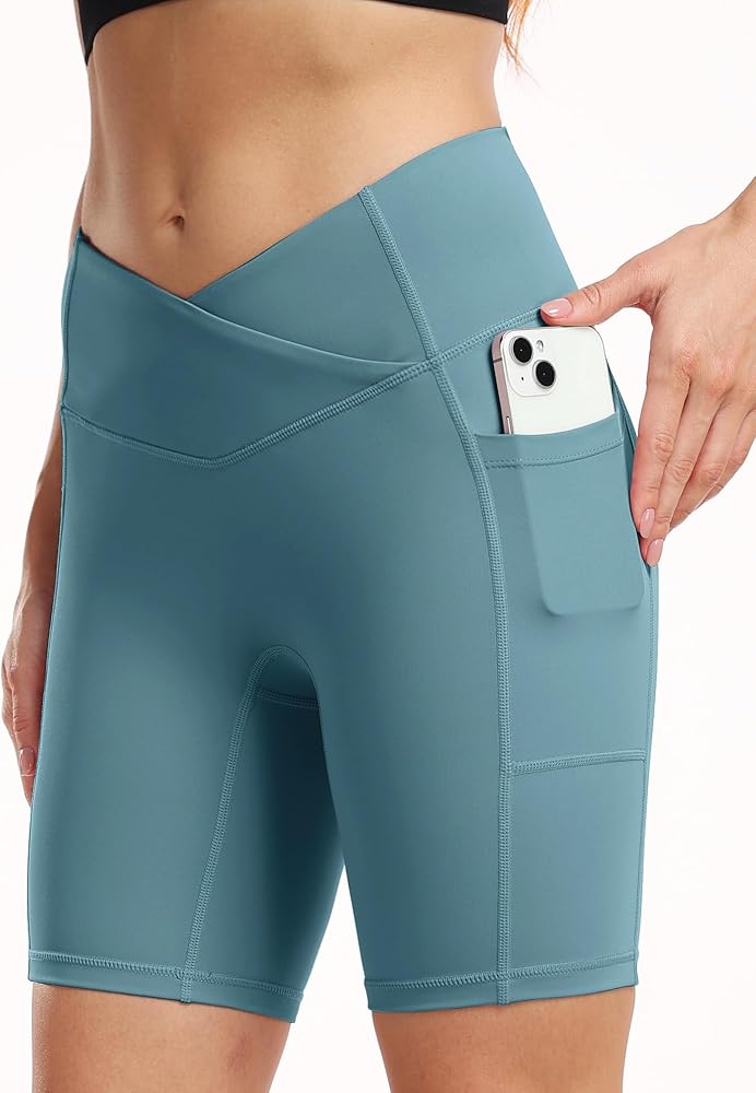 • Crossover High Waisted Biker Shorts with Sexy slimming criss cross v waist, Tummy control squat proof cycling shorts, Supportive ribbed overlapping waistband, Pass the squat test
