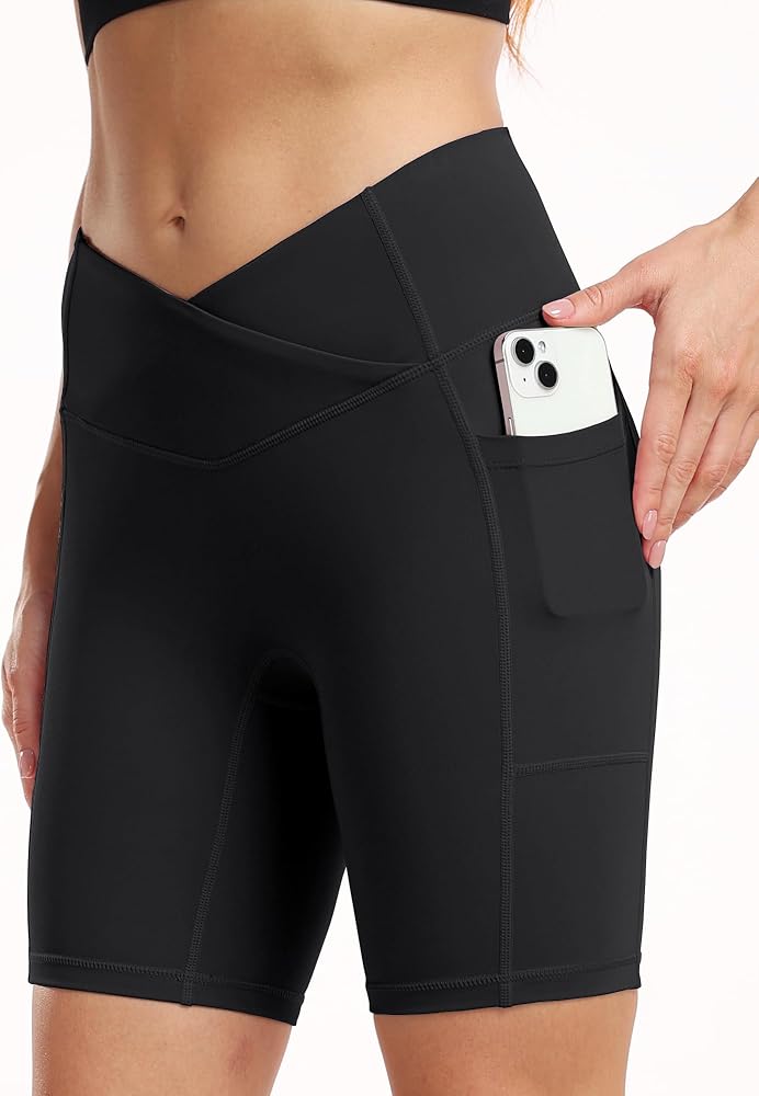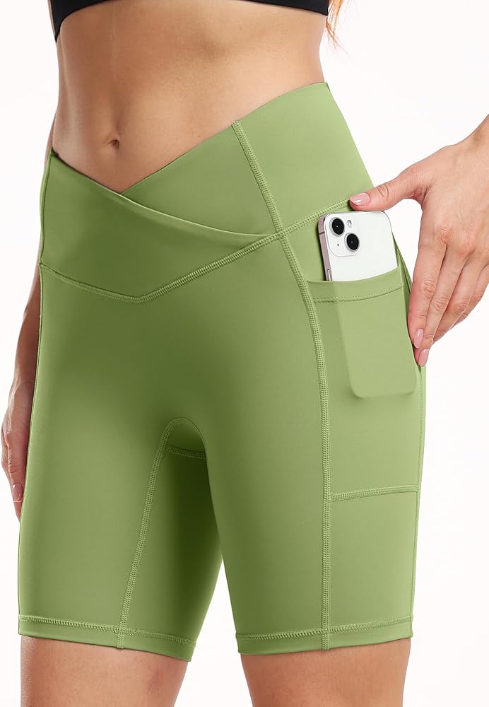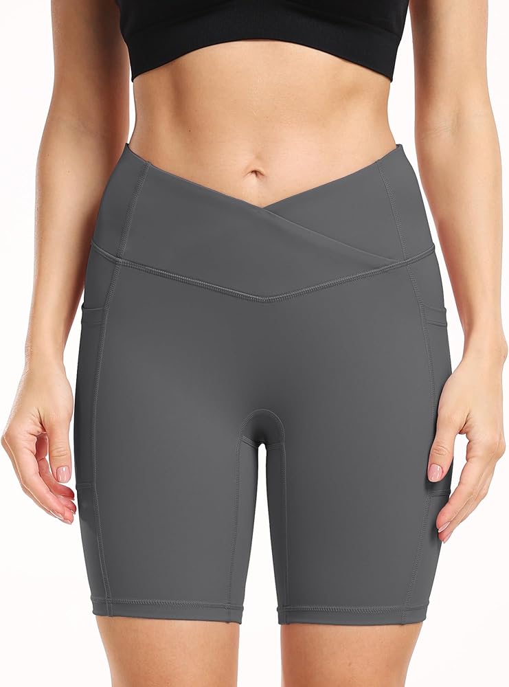 • Crossover High Waisted Biker Shorts with Sexy slimming criss cross v waist, Tummy control squat proof cycling shorts, Supportive ribbed overlapping waistband, Pass the squat test