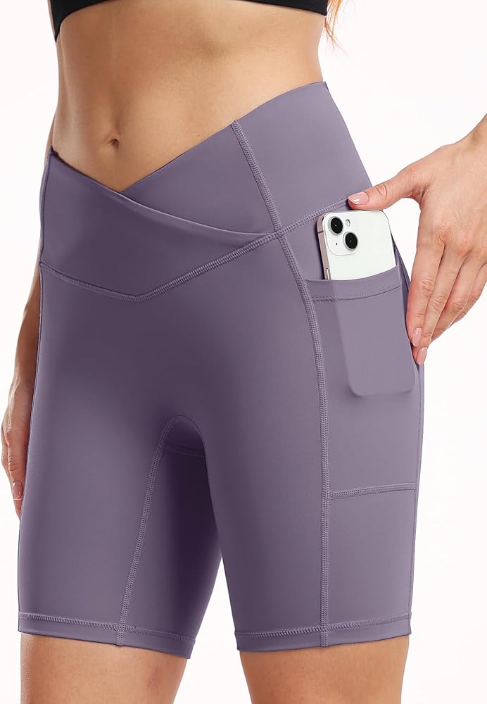 • Crossover High Waisted Biker Shorts with Sexy slimming criss cross v waist, Tummy control squat proof cycling shorts, Supportive ribbed overlapping waistband, Pass the squat test