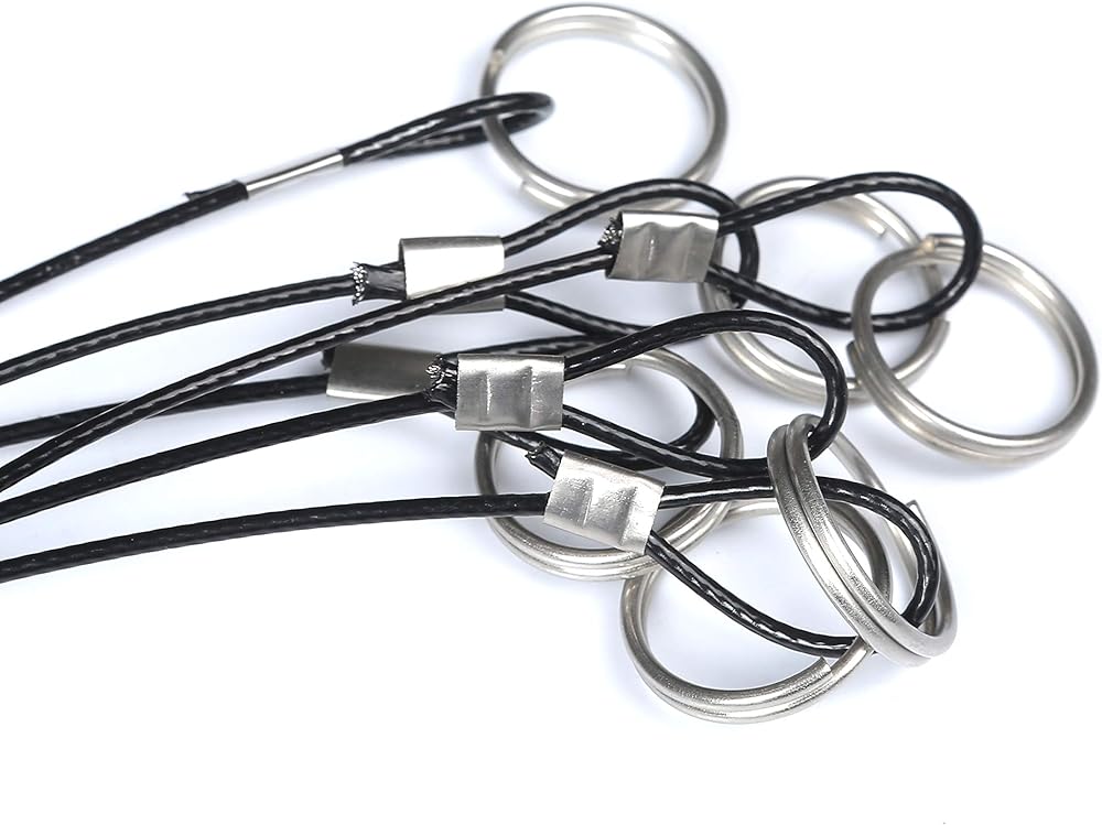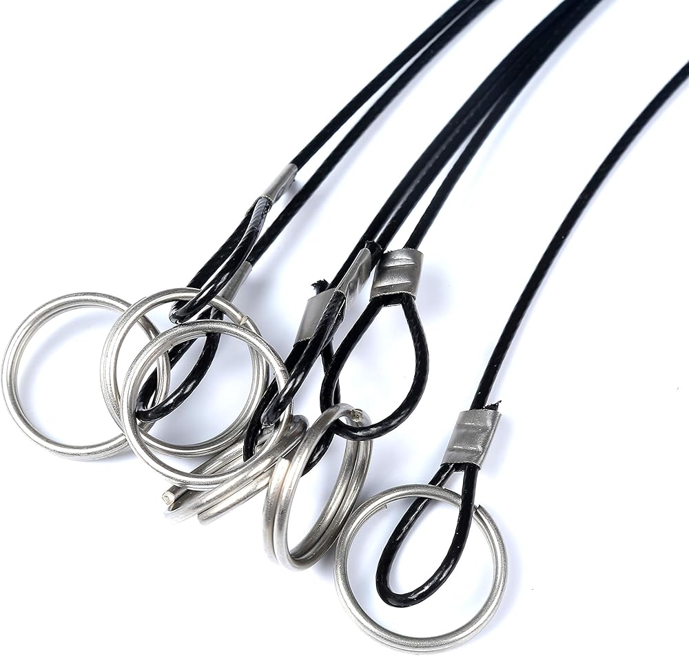 Double loops with ended in wire cable. Easy to use. Wide spaces for linking with one quick release key ring. (Note the loop size)