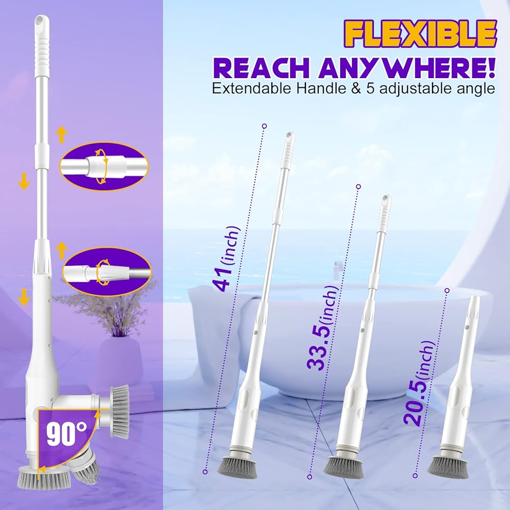 • 😄🎄{𝐄𝐗𝐓𝐄𝐍𝐃𝐀𝐁𝐋𝐄 𝐀𝐑𝐌 & 𝟓-𝐀𝐍𝐆𝐋𝐄 𝐅𝐑𝐄𝐄 𝐀𝐃𝐉𝐔𝐒𝐓𝐌𝐄𝐍𝐓}: The cordless electric spin scrubber is equipped with an extension arm that can be extended to 44.3 inches and 5 adjustable angles designed by the cordless bathroom scrubber, which can be adjusted freely within 90°! The electric shower scrubber makes all kinds of hidden corners unobstructed!