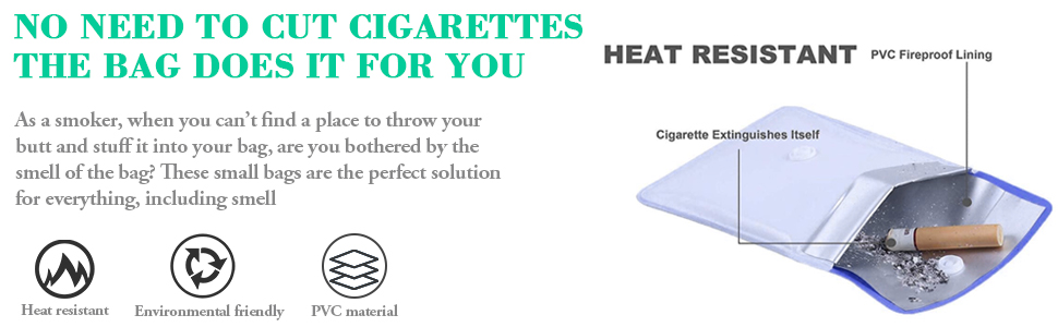مقاومة للحرارة - ليست هناك حاجة لإخراج السجائر، فالحقيبة تقوم بذلك نيابةً عنك، مع بطانة مقاومة للحريق من البولي فينيل كلوريد يمكنك فقط وضع سيجارتك النهائية في منفضة سجائر الجيب وإغلاقها، ثم تطفئ السجائر نفسها وتكون جاهزة للتفريغ. في سلة المهملات عندما يكون ذلك مناسبًا.