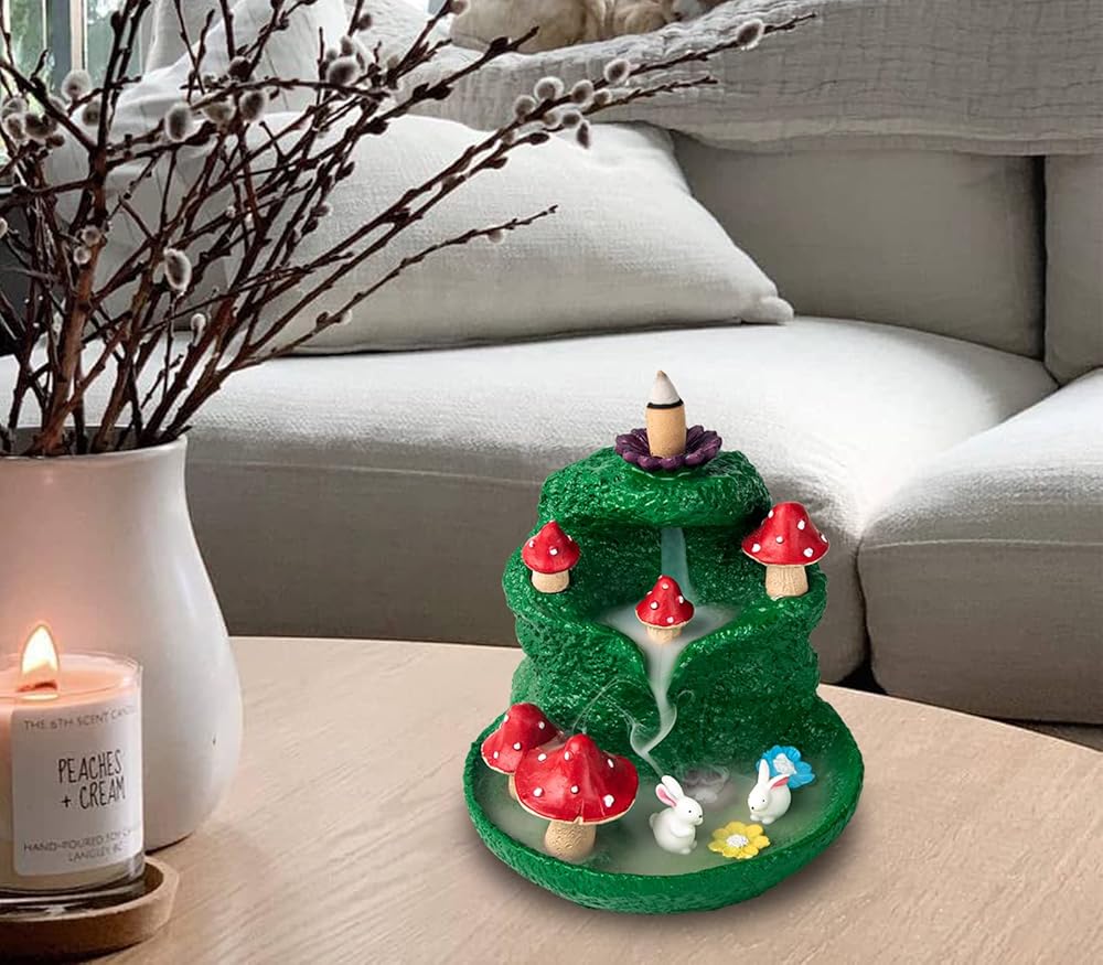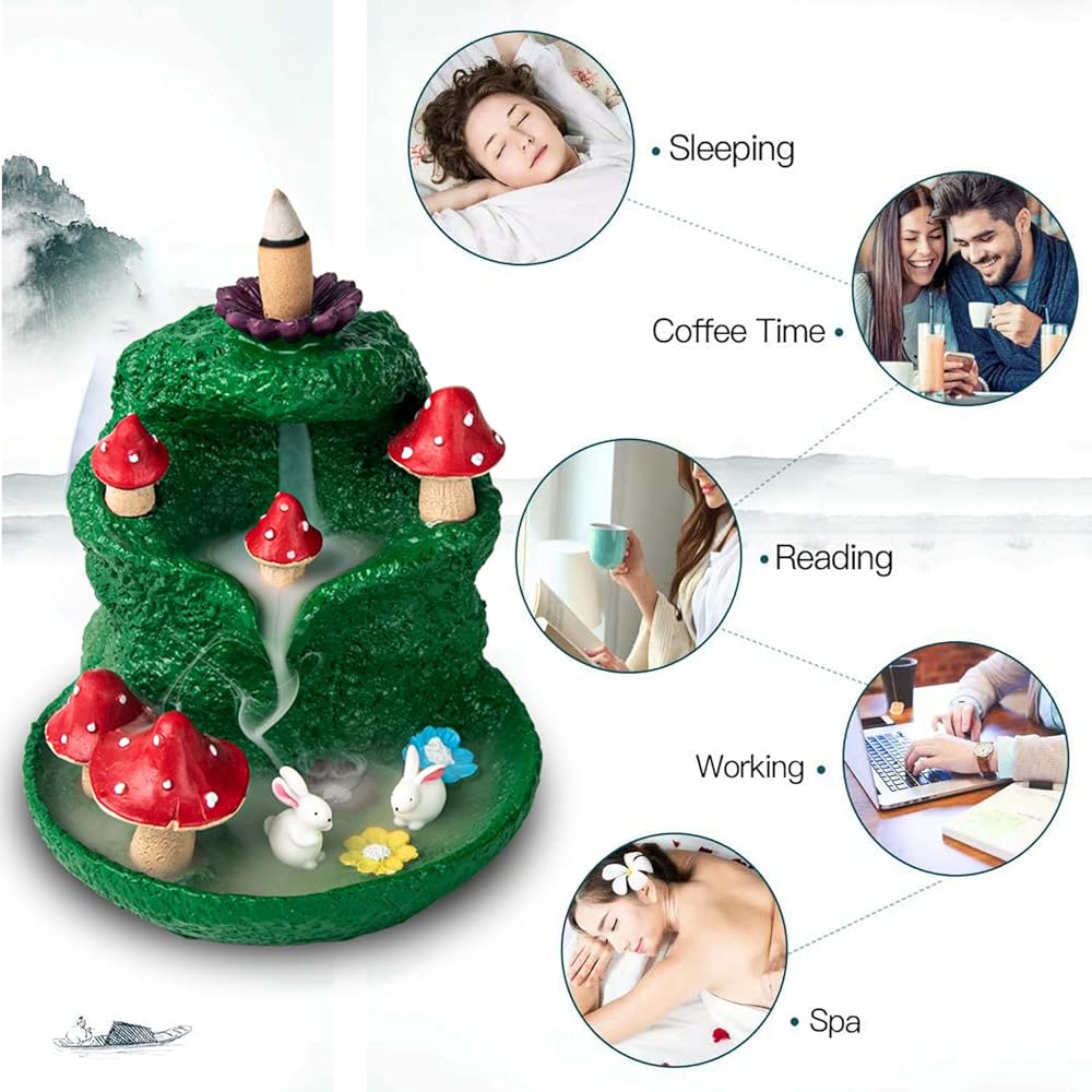 【Vivid Scene】This is a gorgeous mushroom-shaped incense burner with 2 cute rabbit, using a three-layer structure to form a mushroom mountain. When you are buring incense cones, the smoke will drip into the pool like waterfall, which can form a visual effect of flowing water like a waterfall of smoke, 2 rabbits are looming, very vivid.