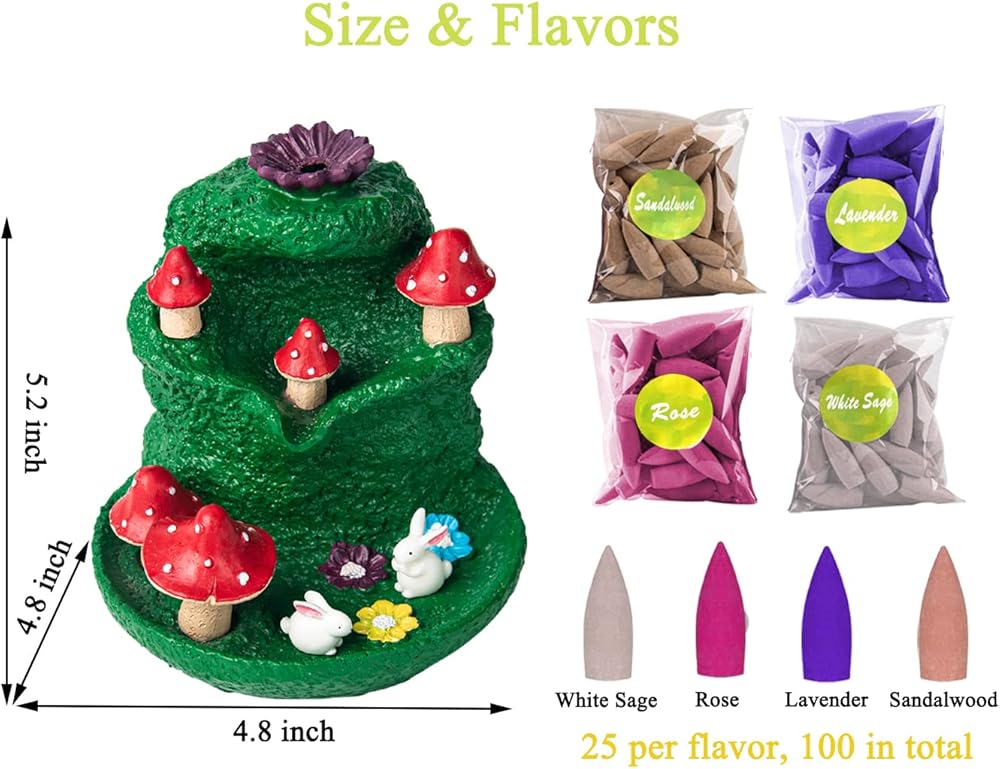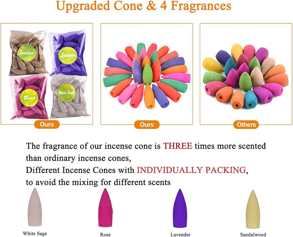 【Upgraded Incense Cones】 Through the latest formula, the fragrance of our incense cone is three times more scented than ordinary incense cones, and the smell is improved. Different Incense Cones with individually packing, to avoid the mixing for different scents. FREE 100 upgraded incense cones.