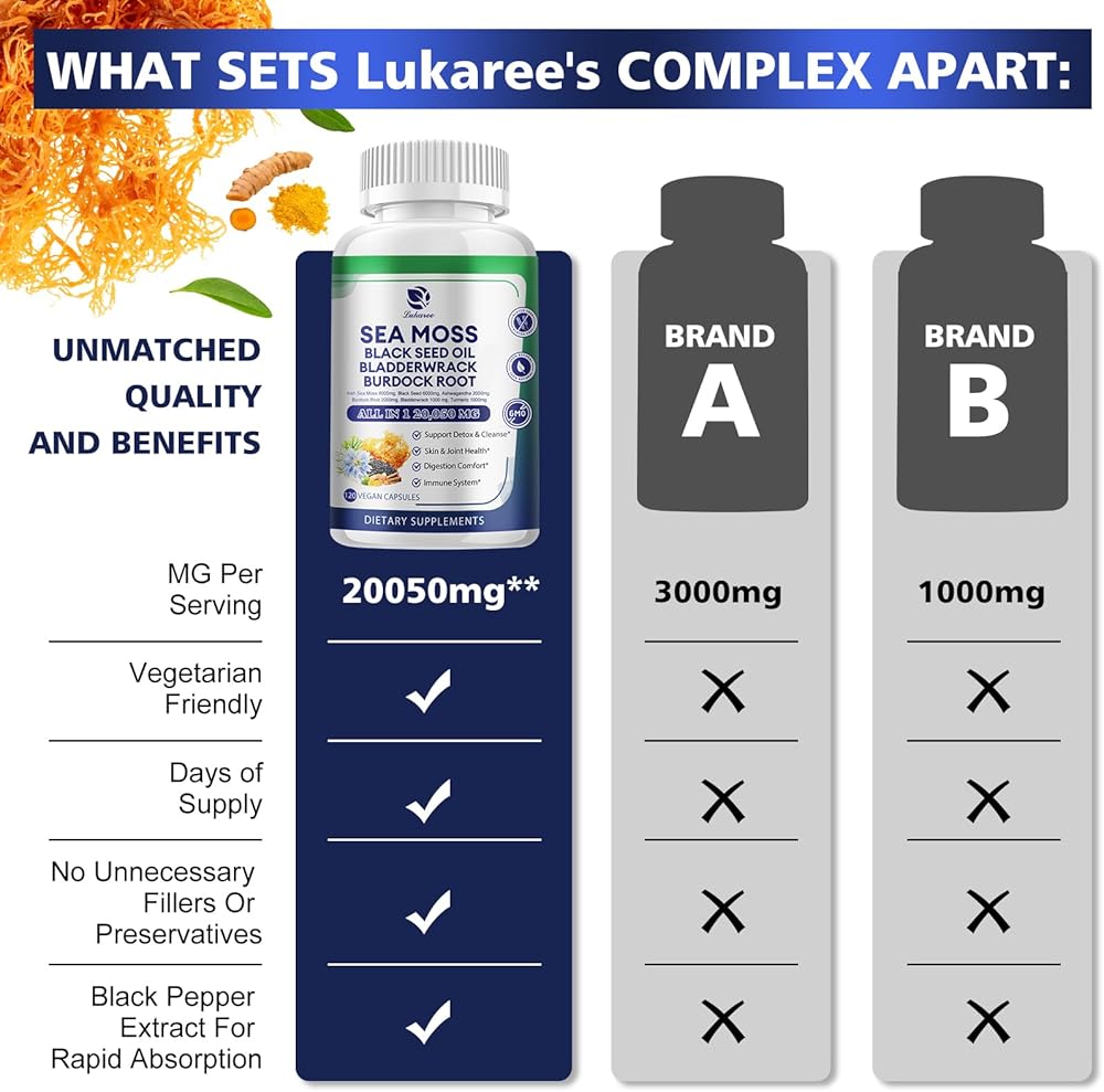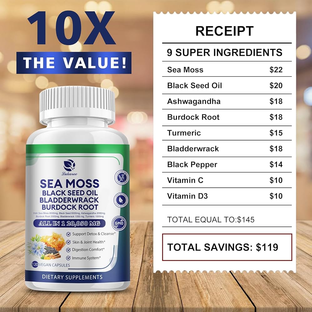 • تركيبة عشبية 9 في 1: تركيبة طبيعية، تحتوي كل كبسولة من طحالب البحر على مكونات معتمدة، بما في ذلك 8000 مجم من طحالب البحر الأيرلندية، 6000 مجم من زيت الحبة السوداء، 2000 مجم من الأشواغاندا، 2000 مجم من جذر الأرقطيون، 1000 مجم من حطام المثانة، 1000 مجم من الكركم والفلفل الأسود وفيتامين. ج و د3. نباتي وغير معدل وراثيًا وخالي من الغلوتين.