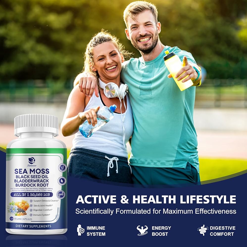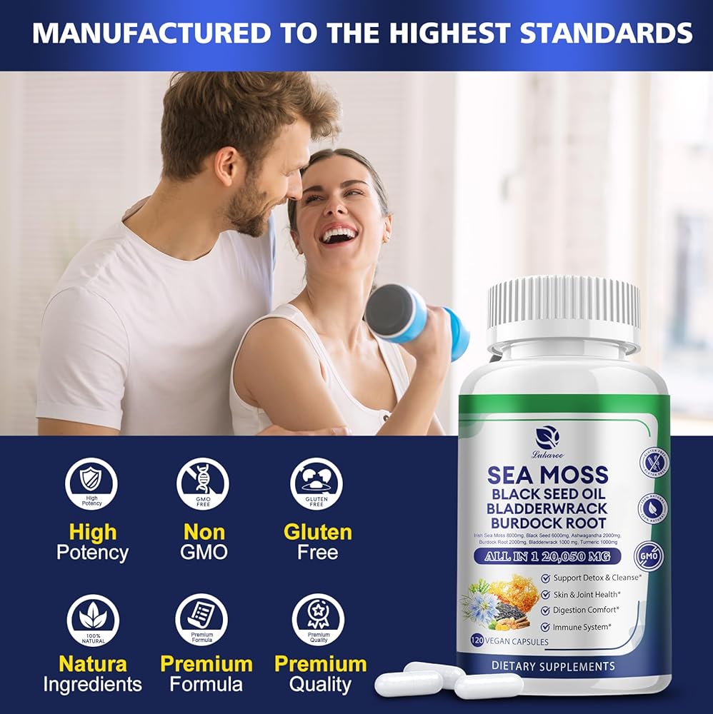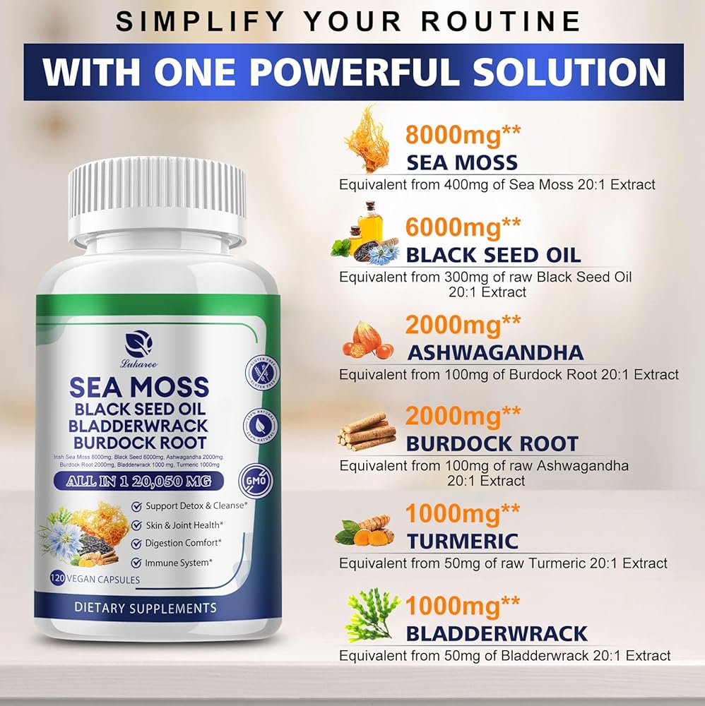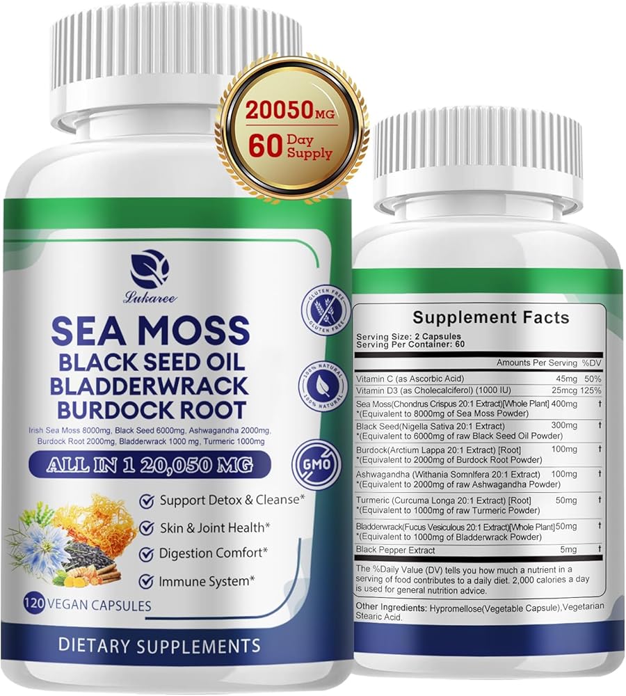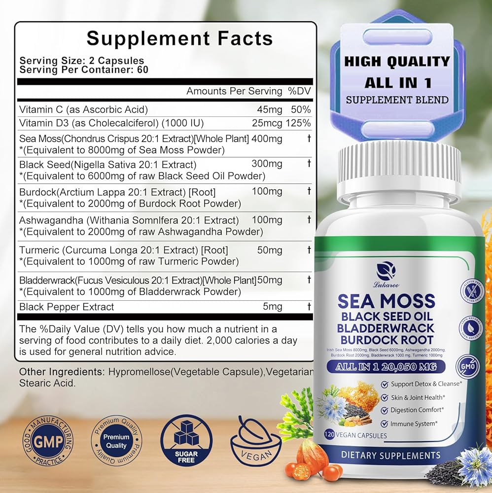 كبسولات طحالب البحر 20,050 مجم مع طحالب البحر الأيرلندية، وزيت الحبة السوداء، والأشواغاندا، وجذور الأرقطيون، ونبات المثانة، والكركم، وفيتامين C D3، ومكملات غذائية فائقة الجودة من طحالب البحر العضوية، 120 كبسولة - نباتية، غير معدلة وراثيًا