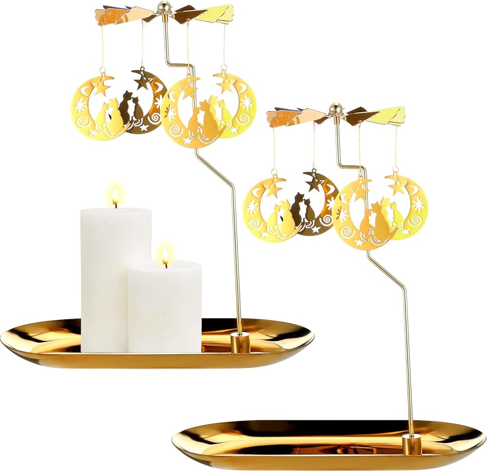 Norme مجموعتان من حامل الشموع الخفيفة الدوارة الدوارة مع صينية ذهبية معدنية لطاحونة الهواء شمعدان دوار للشموع الدائرية لطاولة الزفاف وحفلات الزفاف المركزية هدية تزيين المنزل، قطة القمر الذهبية