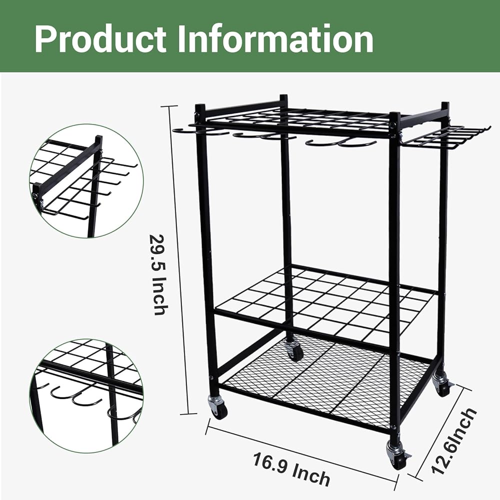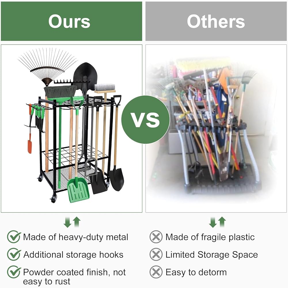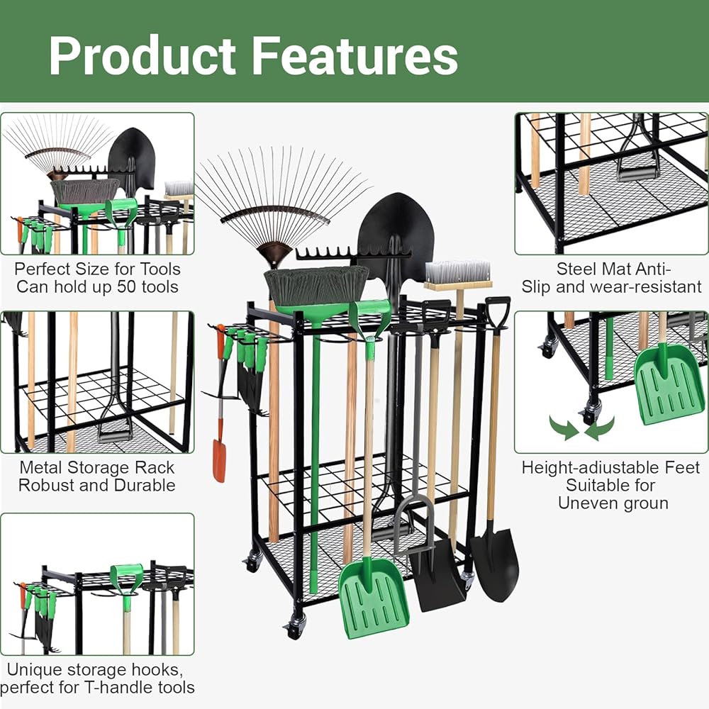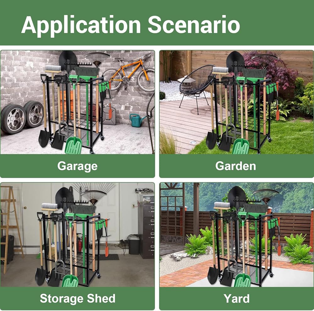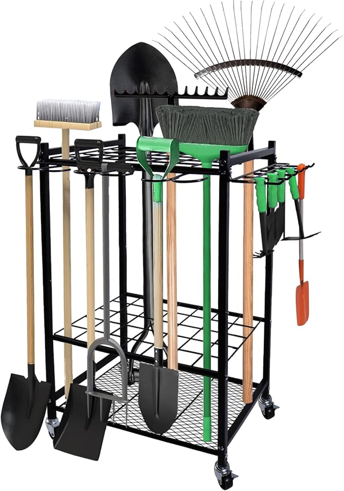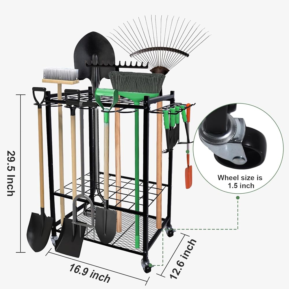 منظم أدوات الحديقة، منظم أدوات الفناء للجراج، منظم أدوات الحديقة بعجلات، ما يصل إلى 35 أداة/مشط/مكانس ذات مقبض طويل، حامل أدوات حديقة فولاذي شديد التحمل للسقيفة، خارجي، أسود