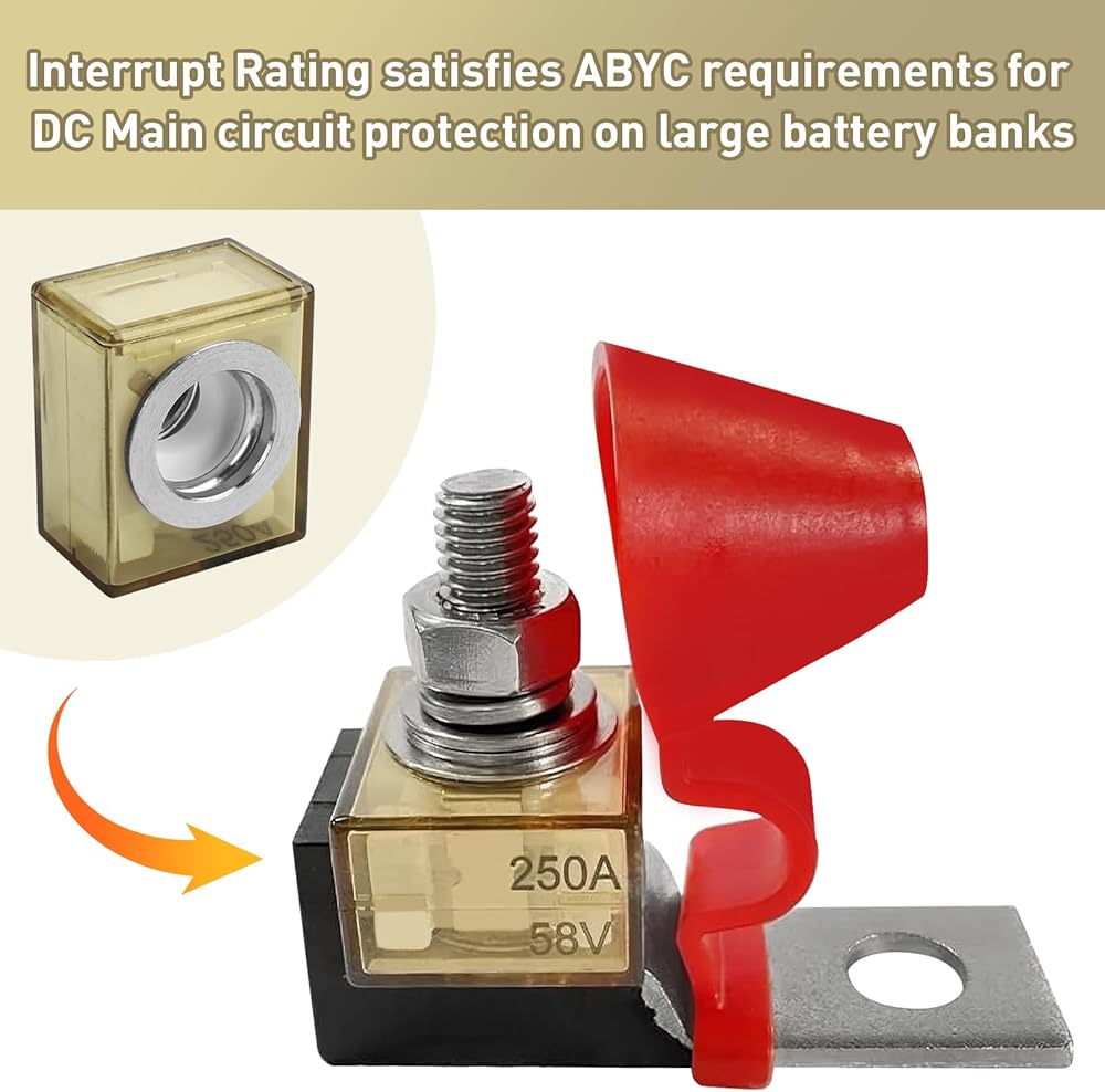 Interrupt Rating satisfies ABYC requirements for DC Main circuit protection on large battery banks.