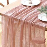 【Cheesecloth Table Runner】Size:35" W x 120" L. Our blushing pink table runner is generously sized to fit most standard-sized tables, allowing you to easily drape it lengthwise or widthwise for a customized look. The soft and gauzy texture of the cheesecloth creates a visually appealing backdrop for your centerpieces, candles, and tableware, adding a subtle and understated elegance to your table setting.