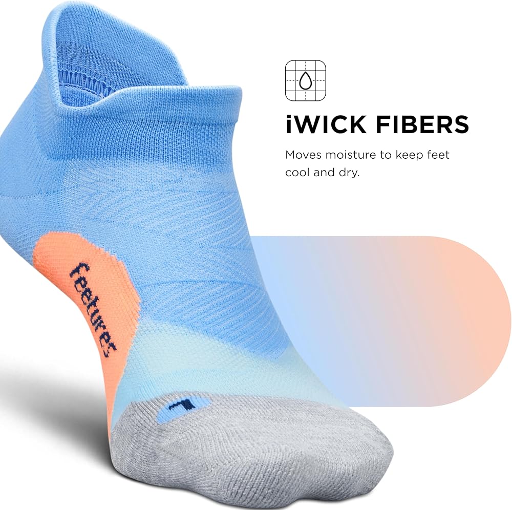 • Breathable Socks for Men & Women: These athletic socks are made with iWICK fibers that wick moisture to keep feet cool and dry; mesh construction of these Feetures socks provide ventilation for added breathability; these running socks with seamless toe feature The Perfect Toe