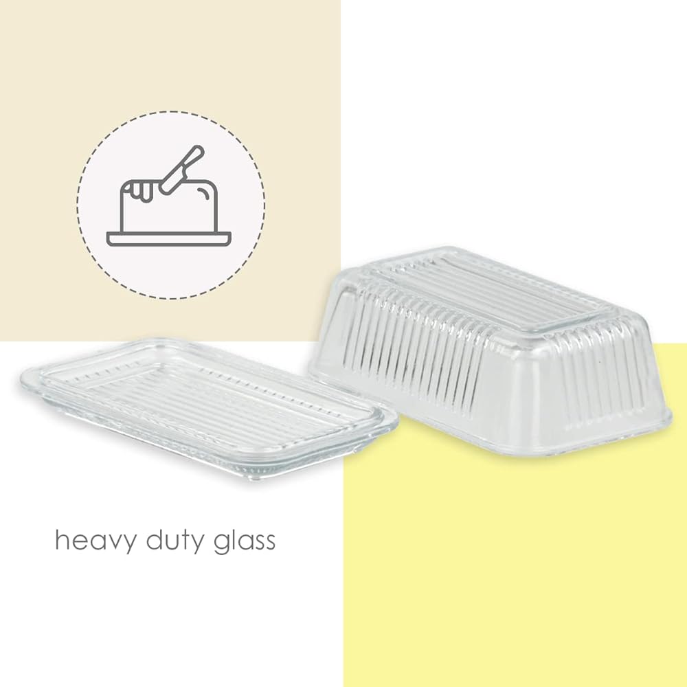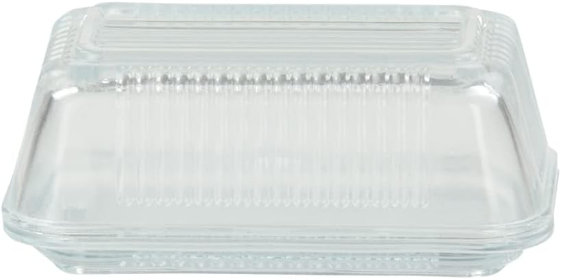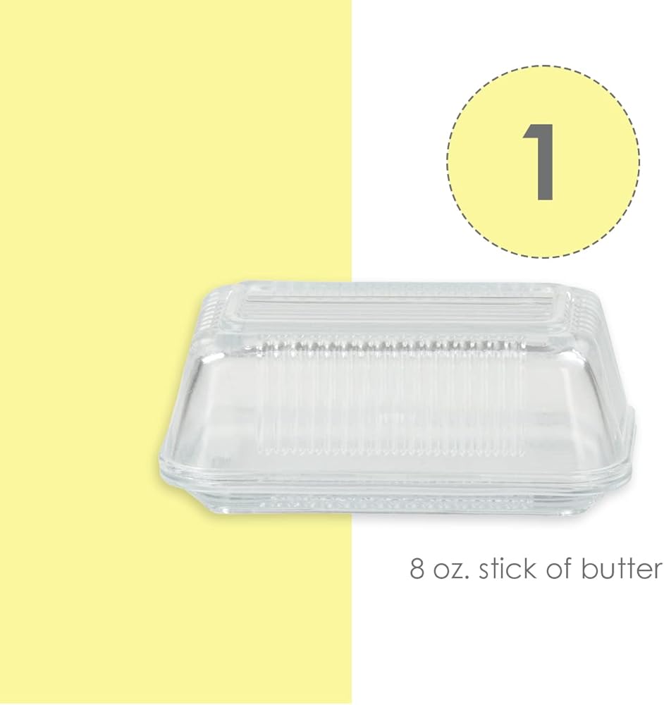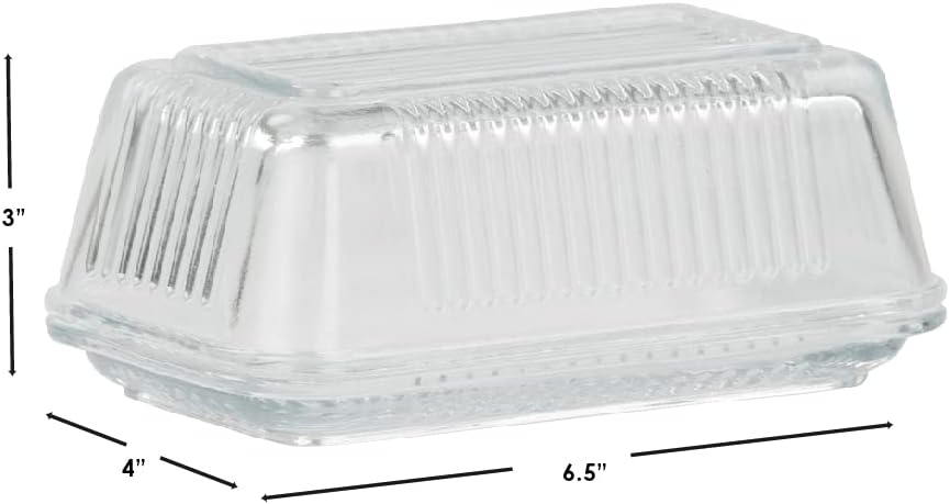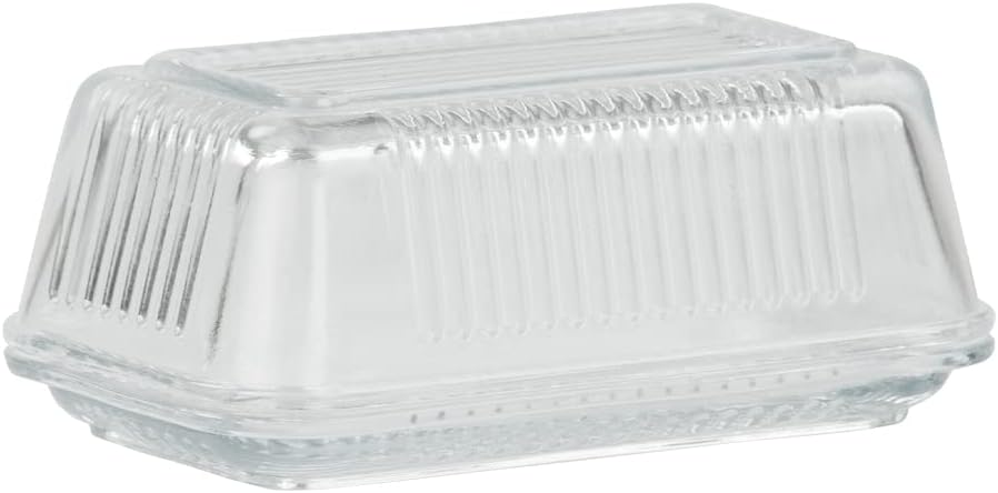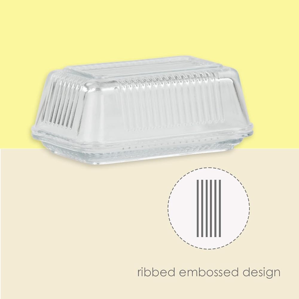 Stop leaving that butter stick in the wrapper and start putting it in this glass butter dish. This butter dish holds a single stick, and it has a compact and slim design that can fit inside a fridge compartment. The heavy-duty glass construction has clear walls so that you can easily see how much butter is left. This modern butter dish has a ribbed exterior that adds a stylish flair to your home. Use this butter holder for general use, or it is perfect to use for entertaining a brunch event. Hand wash to clean.
