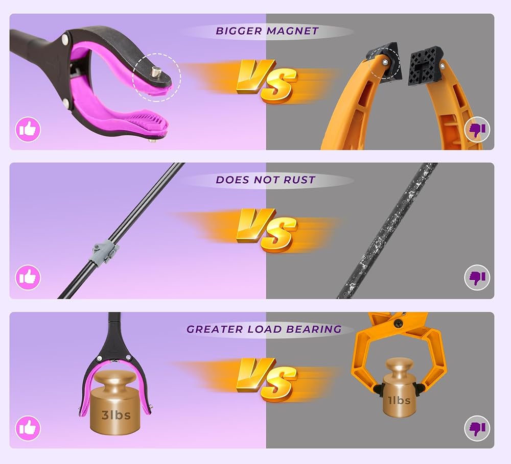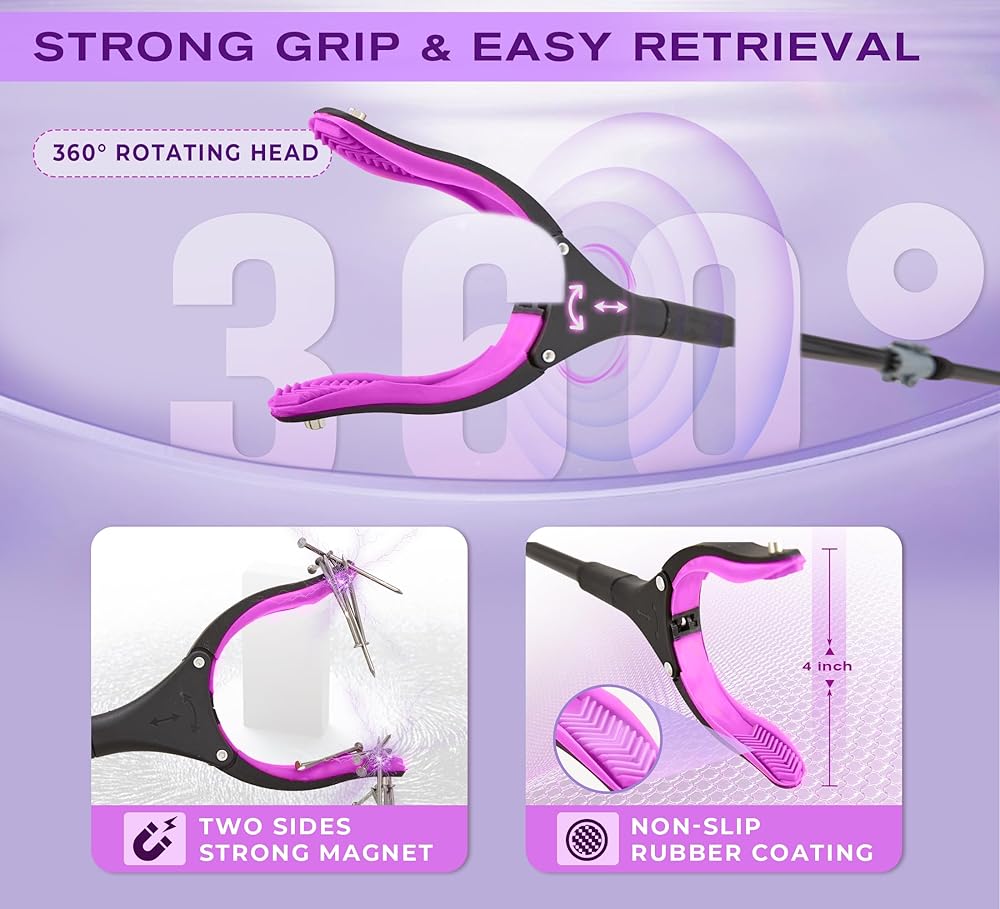 تصميم الفك المحسن: تتميز أدوات الإمساك لدينا برأس دوار 360 درجة وتصميم مغناطيسي مبتكر. الرأس الدوار مصنوع من المطاط الناعم ولا يتطلب أي التواء في الذراع أو المعصم ويمكن تمديده بسهولة في أي اتجاه. بالإضافة إلى ذلك، يسهل المغناطيس التقاط العناصر المعدنية الصغيرة مثل المسامير والمفاتيح والعملات المعدنية