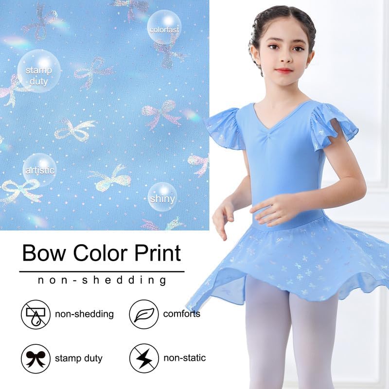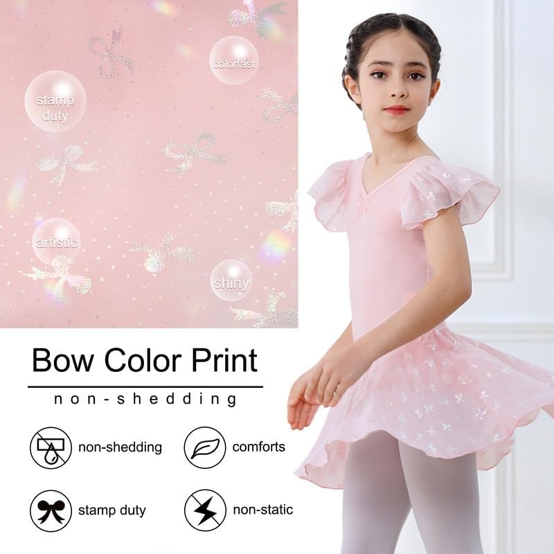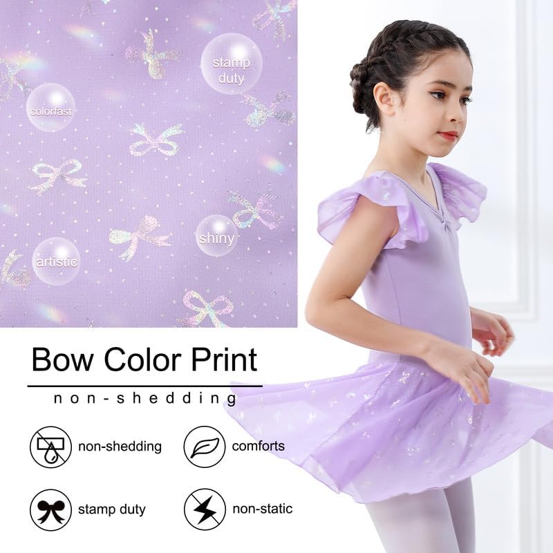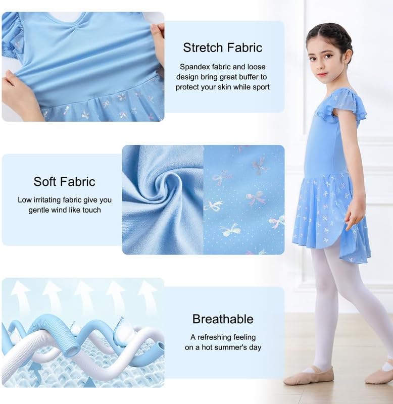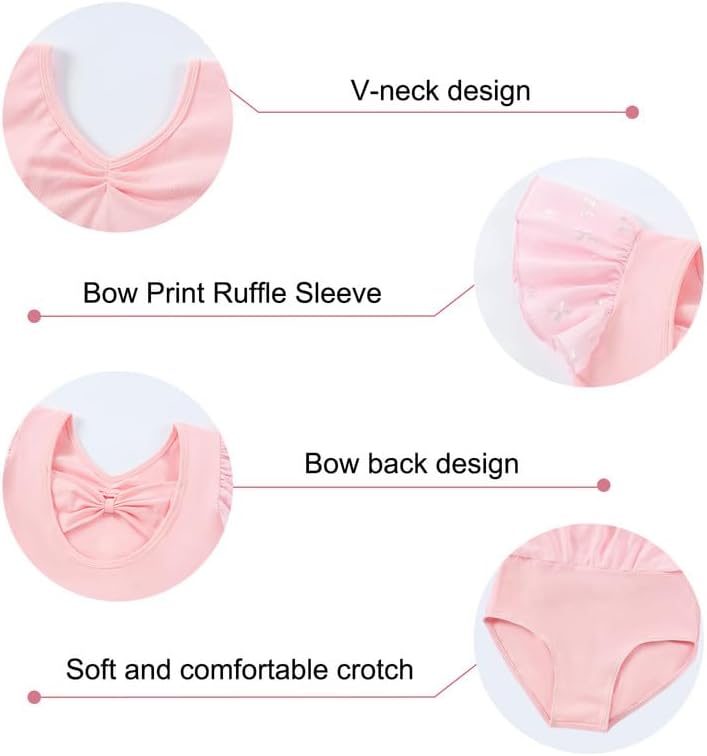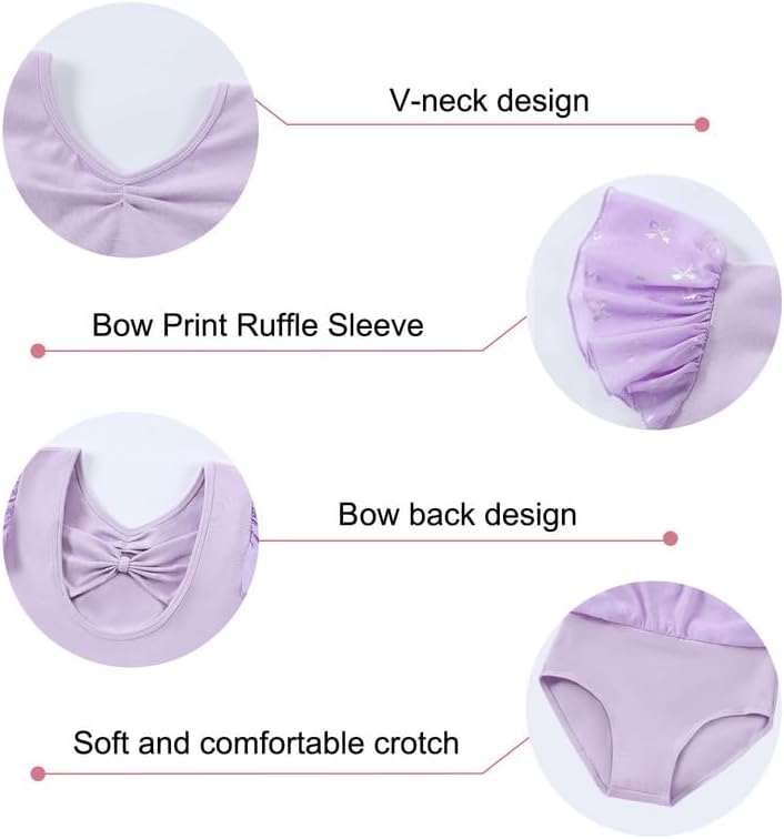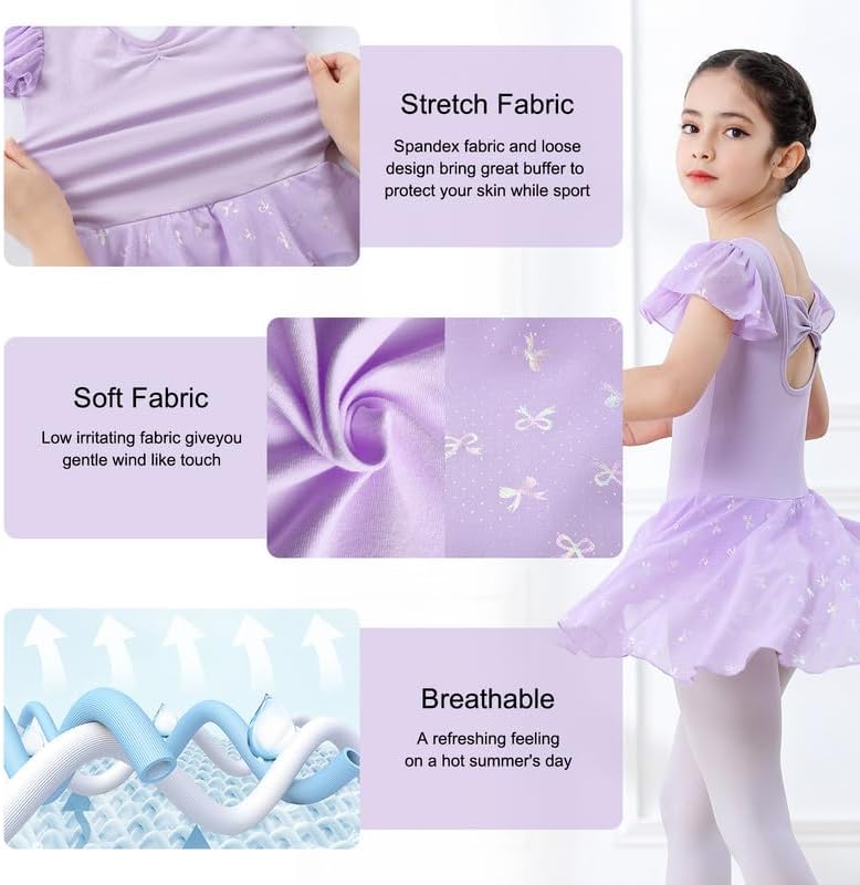 لطيف ومريح: مطبوعات ملونة على شكل فيونكة على الأكمام والتنورة لملابس الباليه للفتيات سوف تتألق بأقل حركة، لطيفة جدًا وجميلة عند ارتدائها. ملابس الرقص مصنوعة من نسيج ناعم مع مرونة فائقة، مما يجعل من السهل على الأطفال القيام بجميع أنواع حركات الرقص، كما أنها مسامية، ويمكن أن تساعد الأطفال على التعرق بشكل أفضل وأكثر راحة في الارتداء.