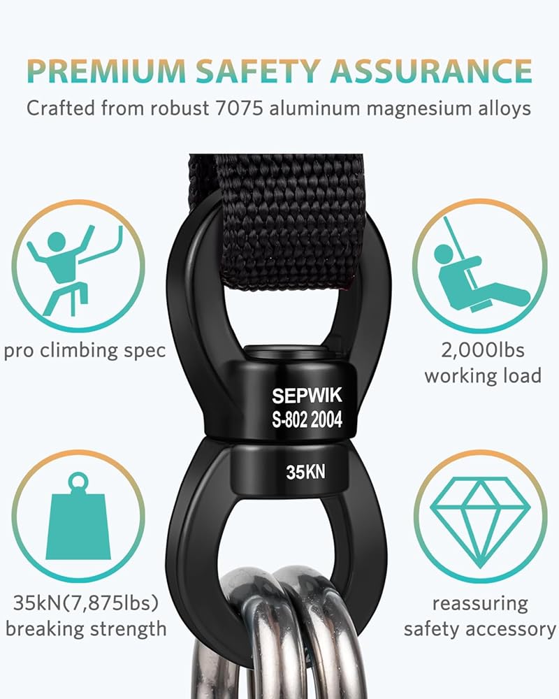 ✔️ ضمان أمان ممتاز - مصنوع من سبائك الألومنيوم والمغنيسيوم القوية 7075 مع لمسة نهائية أنيقة مؤكسدة، يتميز جهاز SEPWIK الدوار للسلامة بجودة صناعية عالية المستوى. إنه يتفوق على الاختبارات الصارمة بقوة كسر تبلغ 35 كيلو نيوتن (7875 رطلًا) ويوصى به بحد حمل عمل يصل إلى 2000 رطل، مما يضمن سلامة لا مثيل لها.