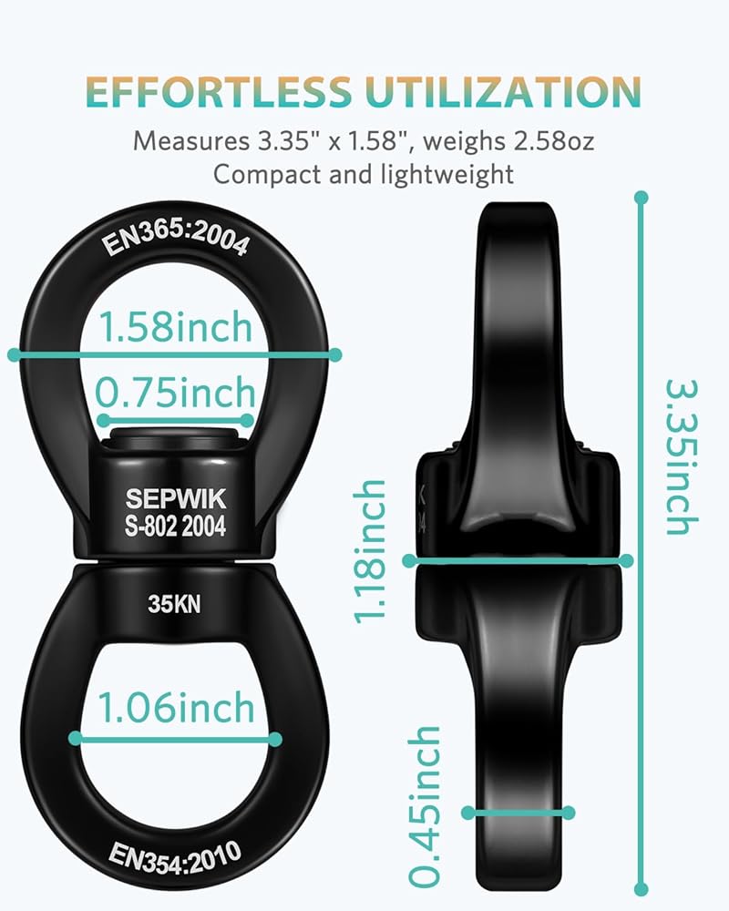 ✔️ استخدام بدون جهد - صغير الحجم وخفيف الوزن، بقياس 3.35 × 1.58 بوصة ويزن 2.58 أونصة فقط، يُعد الدوار الصغير الخاص بنا سهل النقل للمغامرات الخارجية. تتميز بفتحات واسعة للعين، فهي تستوعب ما يصل إلى ثلاث حلقات تسلق بسهولة. مثالية للاستخدام مع الحبال الساكنة والديناميكية، فهي تسهل الدوران السلس بزاوية 360 درجة دون التسبب في عقد.