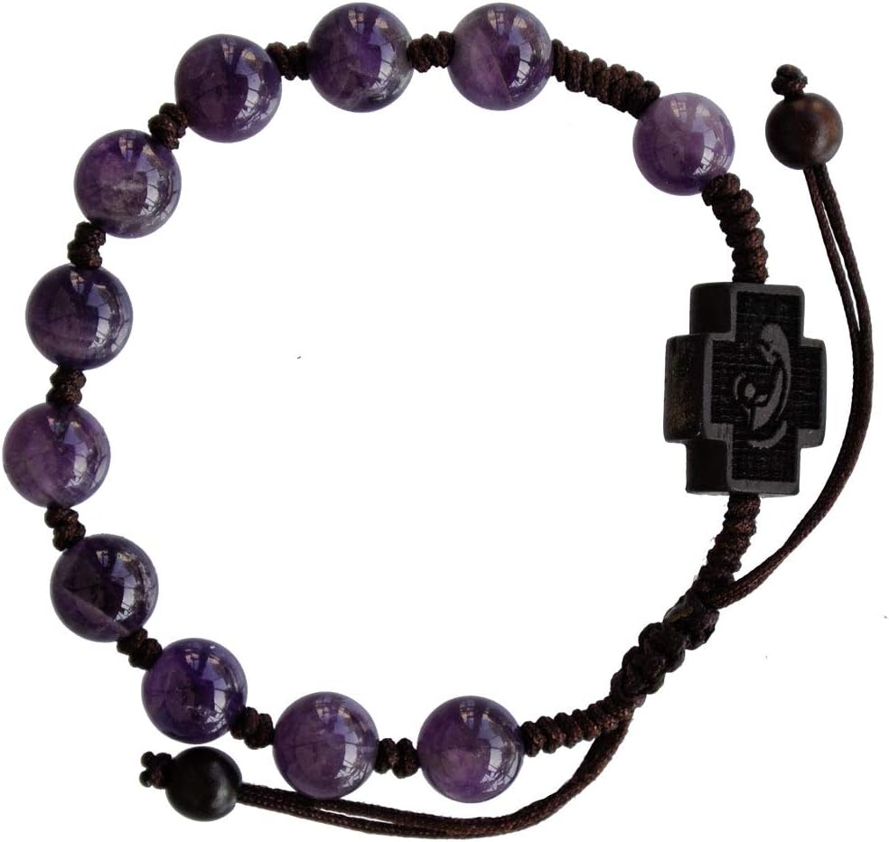 Amethyst & Jujube Wood Adjustable 8mm Rosary Bracelet. Sturdy, durable construction. Smooth, round, amethyst 8mm beads. Double-sided, laser engraved centerpiece with Crucifix on one side and Madonna with Child on the other. Suitable for a man or woman. Easy on and off for praying your rosary anywhere and anytime! What is jujube wood? In Christian tradition, the jujube tree was identified as the thorn bush used to weave Christ's crown of thorns. Based on this tradition, Christian pilgrims to the holy land would take branches of this tree home as symbols of Christ's sacrifice. The wood is heavy and durable and serves for artistic woodwork.