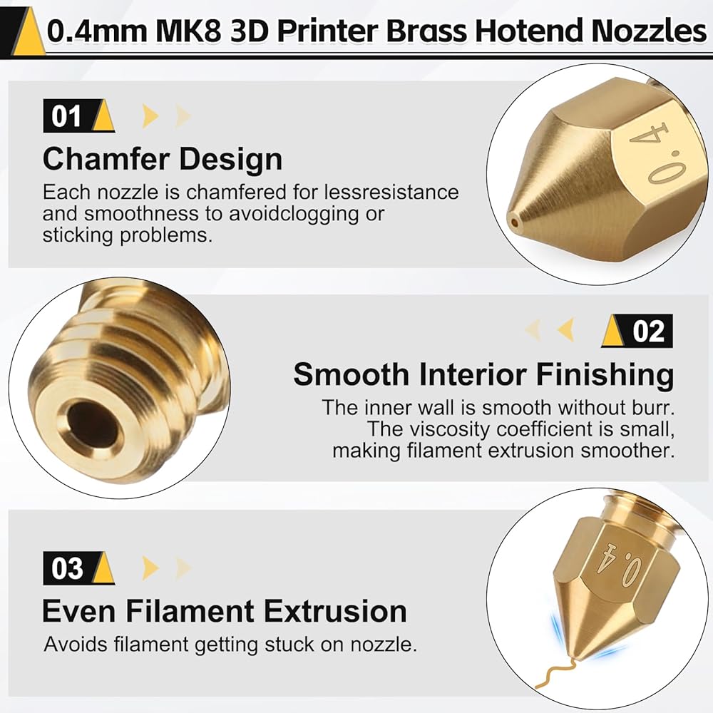 𝐅𝐈𝐍𝐄 𝐖𝐎𝐑𝐊𝐌𝐀𝐍𝐒𝐇𝐈𝐏: تمنع فوهات الطابعة ثلاثية الأبعاد رأس الطباعة بشكل فعال من التسرب وتنتج صورًا ناعمة ومشرقة. تتميز كل فوهة بتصميم مشطوب، مما يضمن مقاومة أقل وأكثر سلاسة، وتجنب مشاكل الانسداد أو الالتصاق. الجزء الداخلي من الفوهة أملس وخالي من النتوءات، مع معامل لزوجة منخفض، مما يسمح بقذف خيوط أكثر سلاسة ويمنع الخيوط من الالتصاق في الفوهة. كما نقدم مفتاح ربط لسهولة التركيب