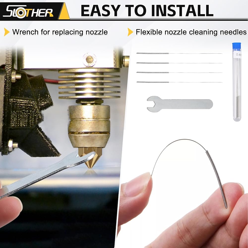 تتضمن مجموعة فوهة الطابعة ثلاثية الأبعاد 4 قطع فوهات 0.4 مم، 2 قطعة 0.2/0.3/0.5/0.6/0.8/1.0 مم، و4 إبر تنظيف الفوهة و1 واط رينش